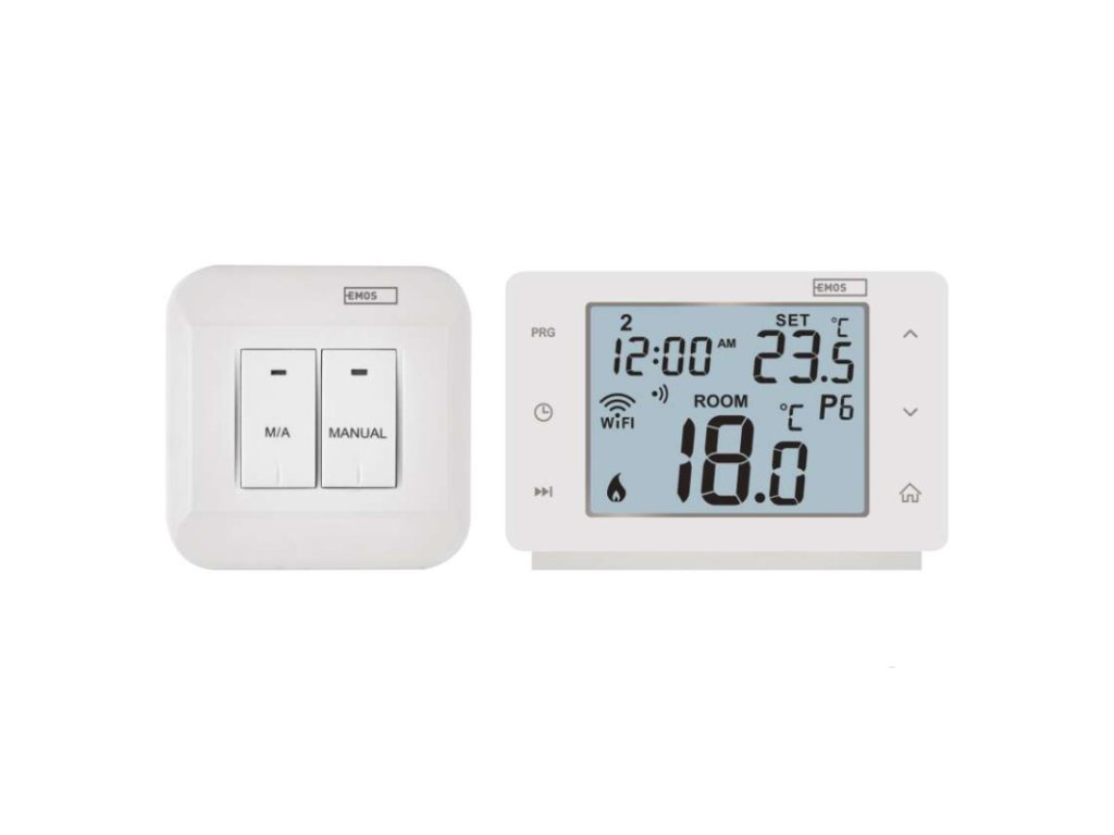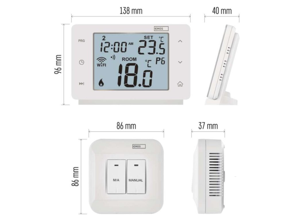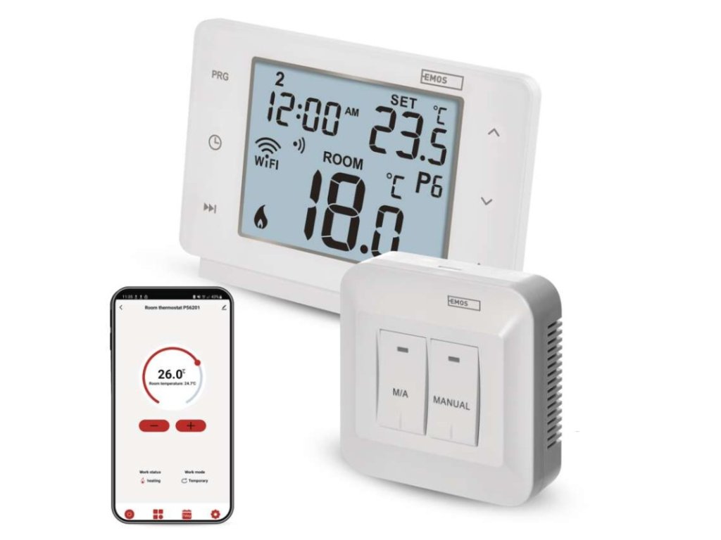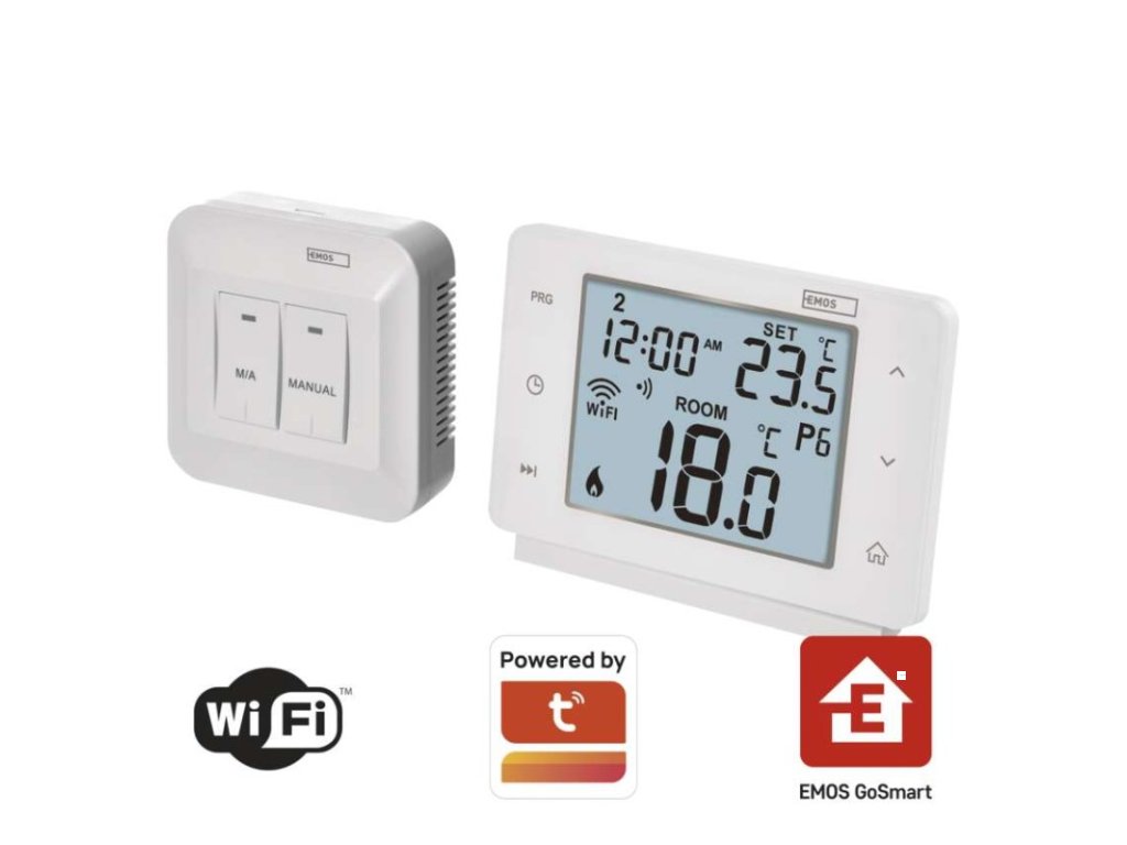 barva: bílá|délka kapilárového čidla: neuvádí se|dosah ve volném prostoru: 100 m|druh regulace: vytápěcí a chladící systém|funkce ON/OFF: ano|funkce prázdniny: ano|funkce Set-back: ne|jazyky aplikace: EN, CZ, SK, PL, DE, HU, SI, FR, + 60 dalších jazyků|kalibrace teploty: ano|kompatibilita: EMOS GoSmart, TUYA, LIDL, Smartlife, Otevřený systém|měření teploty: 0 °C až 40 °C, rozlišení 0,1 °C|možnost propojení s dalšími detektory: neuvádí se|napájení: neuvádí se|napájení brány: neuvádí se|napájení přijímače: 230 V AC|napájení vysílače: 5 V USB adaptér (součástí dodávky)|nastavení teploty: 5 °C až 35 °C, po 0,5 °C|nastavitelný rozptyl teploty: 0,2 °C až 2 °C (rozlišení 0,1 °C)|notifikace do mobilní aplikace: ano|ochrana proti zamrznutí: ano|ovládání hlasovými asistenty: ano (Amazon Alexa, Google Assistant)|počet programů: uživatelsky nastavitelná teplota (6× za den)|podporované OS: Android, iOS|podsvícený displej: ano|pracovní frekvence: 868 MHz|přenosová frekvence: 2,4 GHz WIFI (IEEE802.11b/g/n)|prodejní obal: 1 ks, krabička|protokol: Wi-Fi|rozměr: neuvádí se|rozměr brány: neuvádí se|rozměr přijímače: 37 × 86 × 86 mm|rozměr vysílače: 40 × 138 × 96 mm|součást balení: neuvádí se|spínaná zátěž: 16 A odporově, 4 A induktivně|spínání: 230 V AC nebo beznapěťové|typ nastavení teploty: 6 teplotních změn denně|typ ovládání: programovatelný elektronický pokojový termostat, možnost ovládaní přes mobil (iOS, Android)|typ termostatu: bezdrátovýDoplňkové parametry