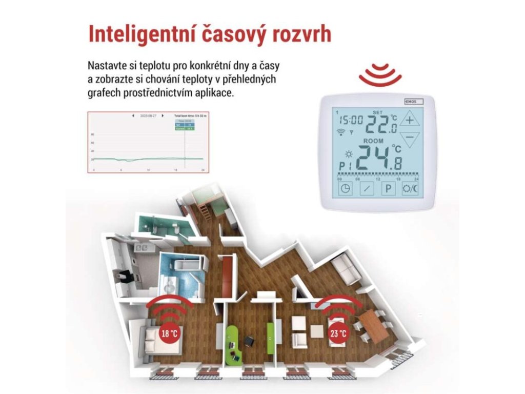 | typ ovládání: | programovatelný elektronický pokojový termostat, možnost ovládaní přes mobil (iOS, Android) |