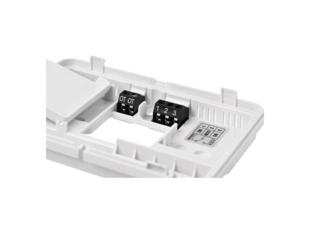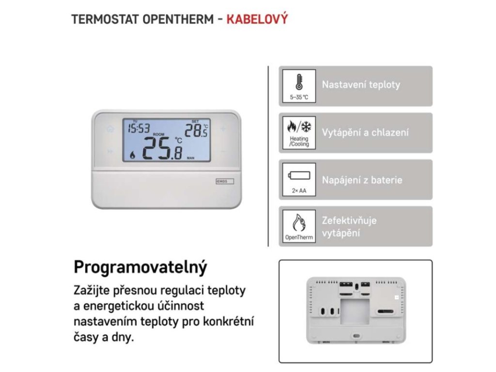 barva: bílá|délka kapilárového čidla: neuvádí se|dosah ve volném prostoru: neuvádí se|druh regulace: vytápěcí a chladící systém|funkce ON/OFF: ano|funkce prázdniny: ano|funkce Set-back: ne|kalibrace teploty: ano|měření teploty: 0 °C až 40 °C, rozlišení 0,1 °C|možnost propojení s dalšími detektory: neuvádí se|napájení: 2× 1,5 V AA (součástí dodávky)|napájení brány: neuvádí se|napájení přijímače: neuvádí se|napájení vysílače: neuvádí se|nastavení teploty: 5 °C až 35 °C, po 0,5 °C|nastavitelný rozptyl teploty: 0,2 °C až 2 °C, po 0,1 °C|ochrana proti zamrznutí: ano|počet programů: 1 uživatelsky nastavitelný program nebo uživatelsky nastavitelná teplota (6× za den)|podsvícený displej: ano|pracovní frekvence: neuvádí se|prodejní obal: 1 ks, krabička|protokol: –|rozměr: 26 × 126 × 84 mm|rozměr brány: neuvádí se|rozměr přijímače: neuvádí se|rozměr vysílače: neuvádí se|součást balení: neuvádí se|spínaná zátěž: 6 A odporově, 2 A induktivně|spínání: 230 V AC nebo beznapěťové|typ nastavení teploty: 6 teplotních změn denně|typ ovládání: programovatelný elektronický pokojový termostat|typ termostatu: drátový s OpenTherm komunikacíDoplňkové parametry