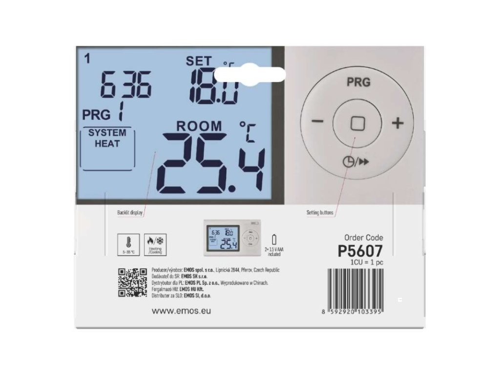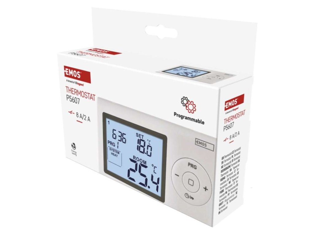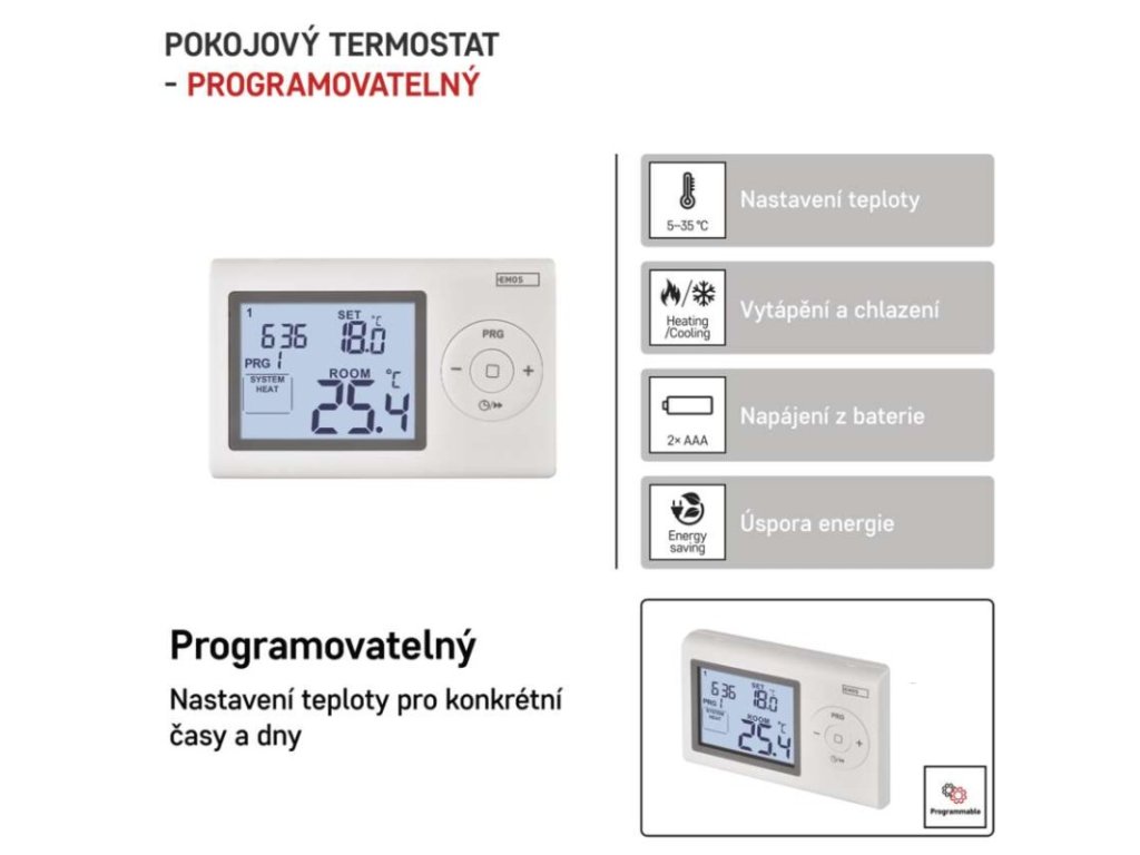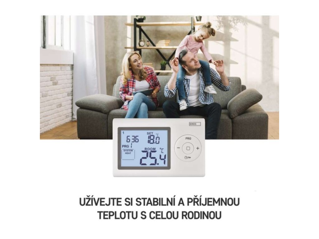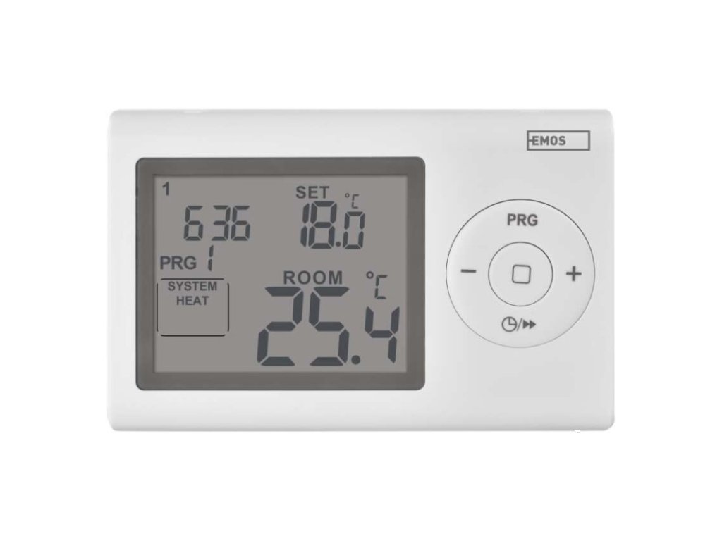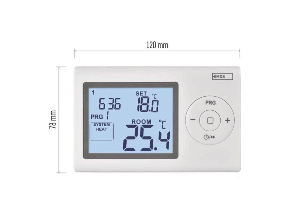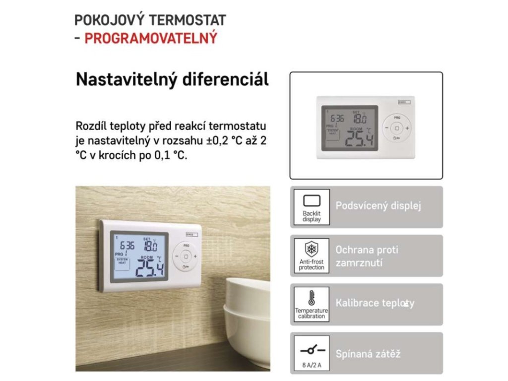 barva: bílá|délka kapilárového čidla: neuvádí se|dosah ve volném prostoru: neuvádí se|druh regulace: vytápěcí a chladící systém|funkce ON/OFF: ne|funkce prázdniny: ne|funkce Set-back: ne|kalibrace teploty: ano|měření teploty: 0 °C až 40 °C, rozlišení 0,1 °C|možnost propojení s dalšími detektory: neuvádí se|napájení: 2× 1,5 V AAA (součástí dodávky)|napájení brány: neuvádí se|napájení přijímače: neuvádí se|napájení vysílače: neuvádí se|nastavení teploty: 5 °C až 35 °C, po 0,5 °C|nastavitelný rozptyl teploty: 0,2 °C až 2 °C, po 0,1 °C|ochrana proti zamrznutí: ano|počet programů: 1 uživatelsky nastavitelný program nebo uživatelsky nastavitelná teplota (6× za den)|podsvícený displej: ano|pracovní frekvence: neuvádí se|prodejní obal: 1 ks, krabička|protokol: –|rozměr: 26 × 120 × 78 mm|rozměr brány: neuvádí se|rozměr přijímače: neuvádí se|rozměr vysílače: neuvádí se|součást balení: neuvádí se|spínaná zátěž: 8 A odporově, 2 A induktivně|spínání: 230 V AC nebo beznapěťové|typ nastavení teploty: 6 teplotních změn denně|typ ovládání: programovatelný elektronický pokojový termostat|typ termostatu: drátovýDoplňkové parametry