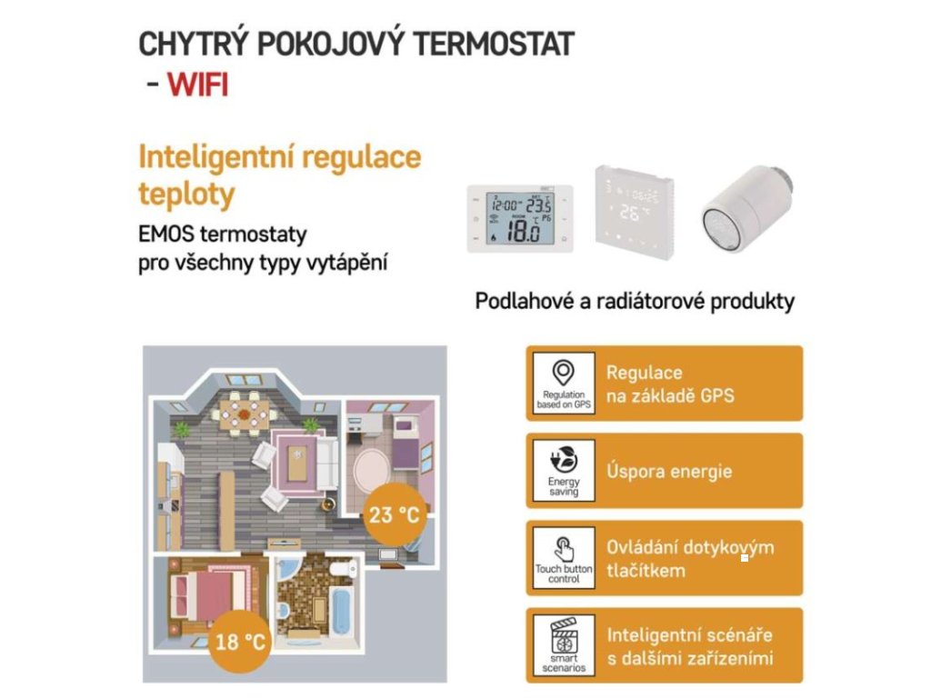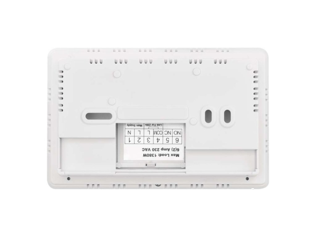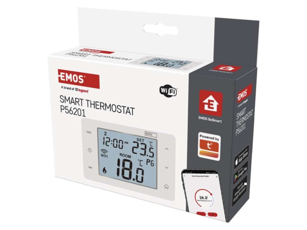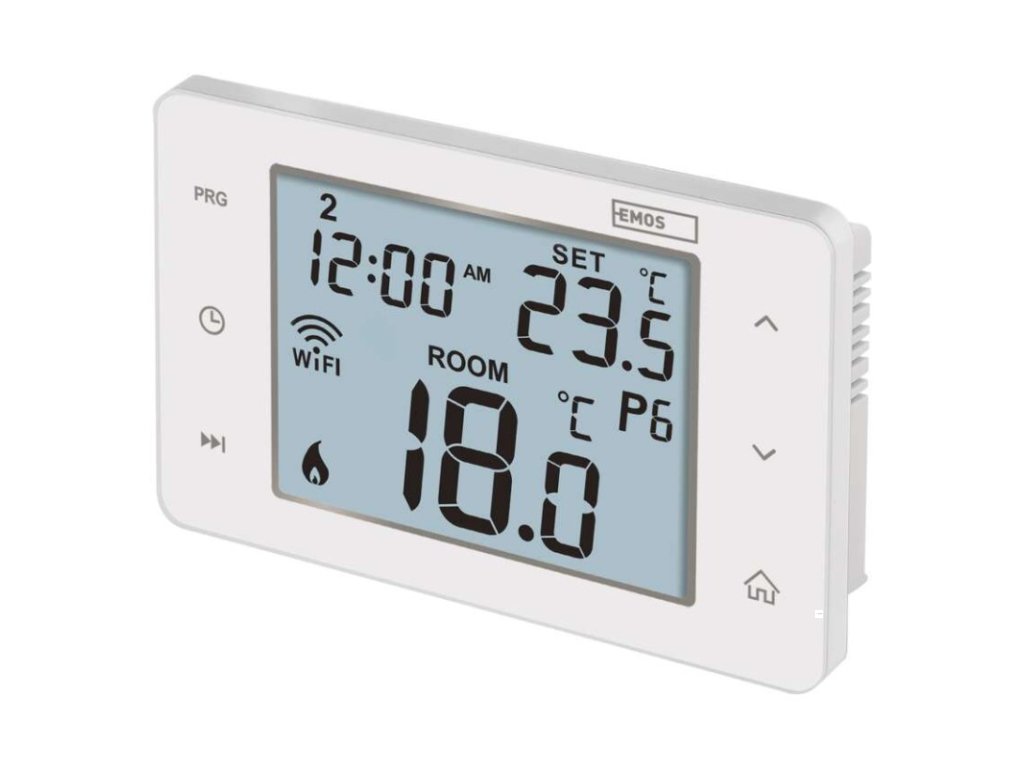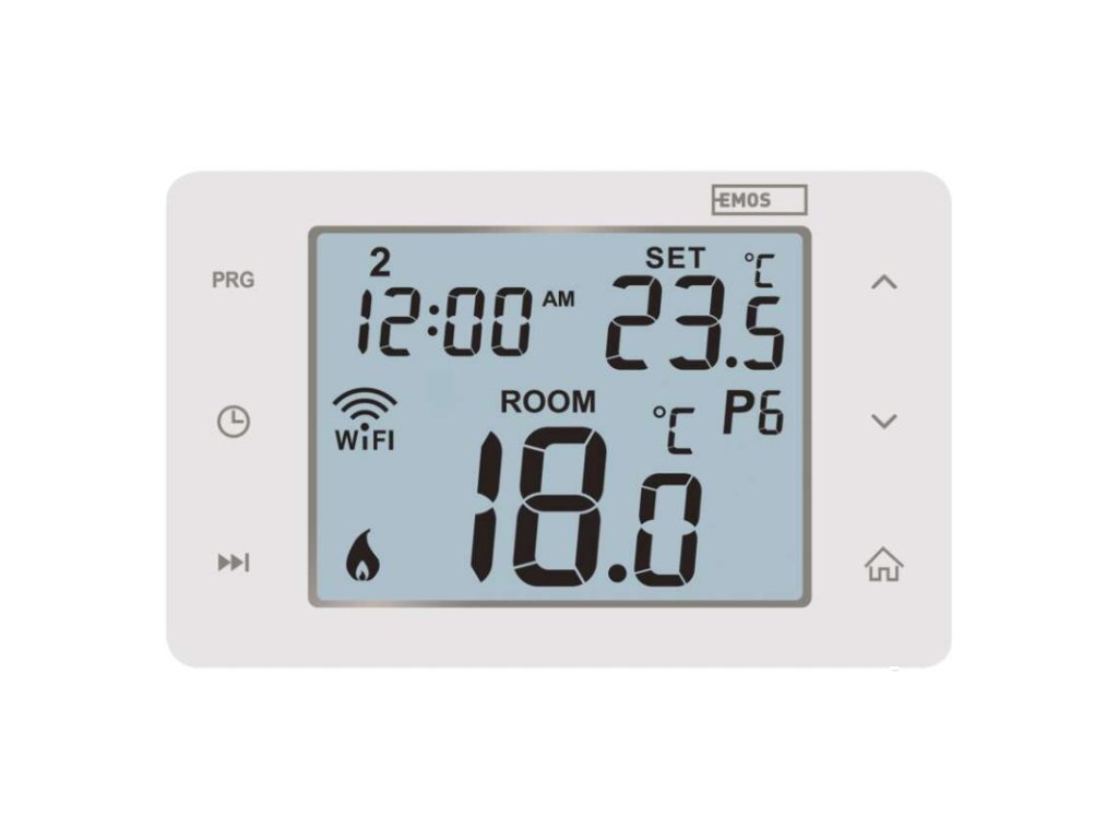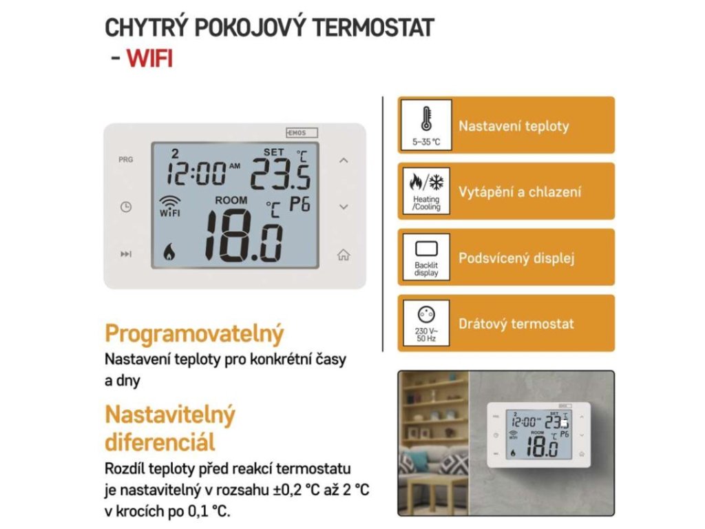 barva: bílá|délka kapilárového čidla: neuvádí se|dosah ve volném prostoru: neuvádí se|druh regulace: vytápěcí a chladící systém|funkce ON/OFF: ano|funkce prázdniny: ano|funkce Set-back: ne|jazyky aplikace: EN, CZ, SK, PL, DE, HU, SI, FR, + 60 dalších jazyků|kalibrace teploty: ano|kompatibilita: EMOS GoSmart, TUYA, LIDL, Smartlife, Otevřený systém|měření teploty: 0 °C až 40 °C, rozlišení 0,1 °C|možnost propojení s dalšími detektory: neuvádí se|napájení: 230 V AC|napájení brány: neuvádí se|napájení přijímače: neuvádí se|napájení vysílače: neuvádí se|nastavení teploty: 5 °C až 35 °C, po 0,5 °C|nastavitelný rozptyl teploty: 0,2 °C až 2 °C (rozlišení 0,1 °C)|notifikace do mobilní aplikace: ano|ochrana proti zamrznutí: ano|ovládání hlasovými asistenty: ano (Amazon Alexa, Google Assistant)|počet programů: uživatelsky nastavitelná teplota (6× za den)|podlahové čidlo: –|podporované OS: Android, iOS|podsvícený displej: ano|pracovní frekvence: neuvádí se|přenosová frekvence: 2,4 GHz WIFI (IEEE802.11b/g/n)|prodejní obal: 1 ks, krabička|protokol: Wi-Fi|rozměr: 138 × 88 × 33 mm|rozměr brány: neuvádí se|rozměr přijímače: neuvádí se|rozměr vysílače: neuvádí se|součást balení: neuvádí se|spínaná zátěž: 6 A odporově, 2 A induktivně|spínání: 230 V AC nebo beznapěťové|typ nastavení teploty: 6 teplotních změn denně|typ ovládání: programovatelný elektronický pokojový termostat, možnost ovládaní přes mobil (iOS, Android)|typ termostatu: drátovýDoplňkové parametry