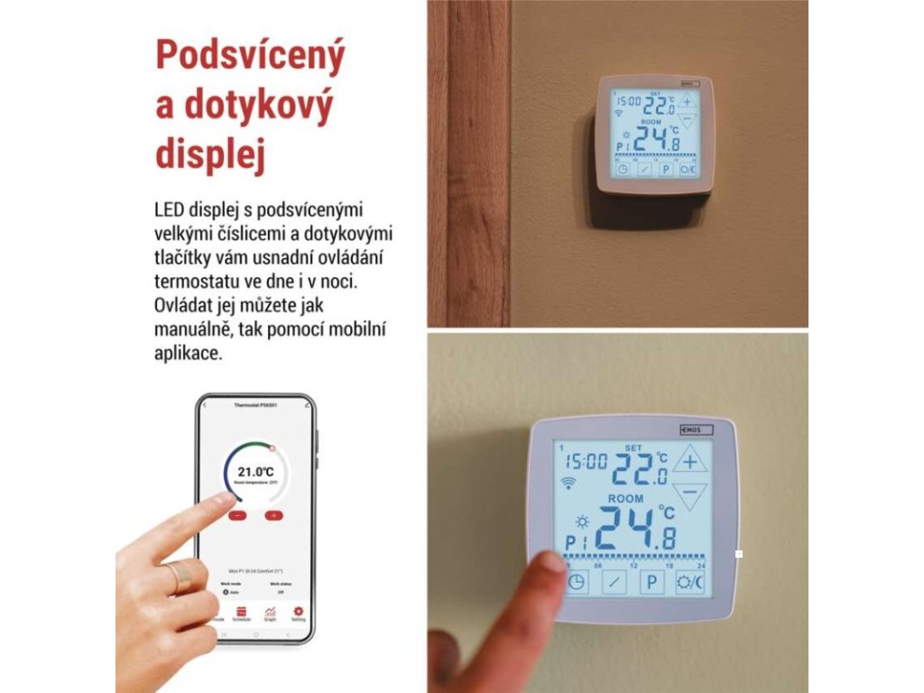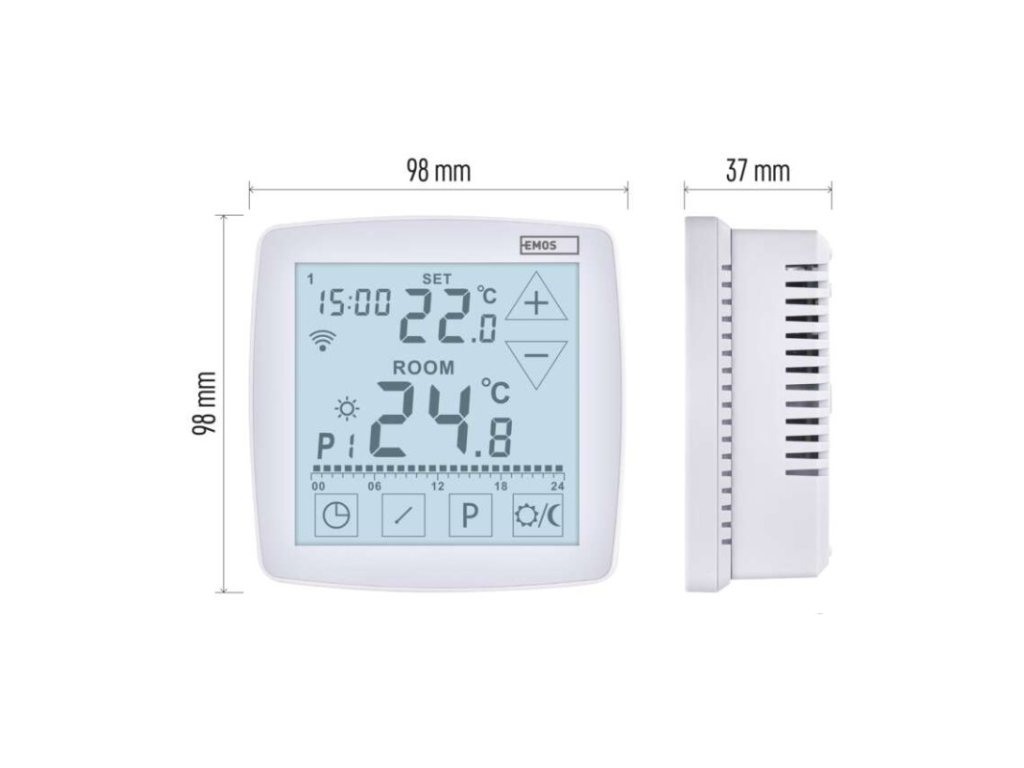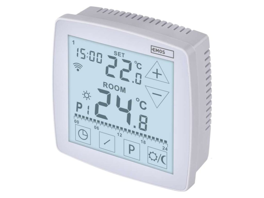 barva: bílá|délka kapilárového čidla: –|dosah ve volném prostoru: –|druh regulace: vytápěcí a chladící systém|funkce ON/OFF: ano|funkce prázdniny: ano|funkce Set-back: ne|jazyky aplikace: EN, CZ, SK, PL, DE, HU, SI, FR, + 60 dalších jazyků|kalibrace teploty: ano|kompatibilita: EMOS GoSmart, TUYA, LIDL, Smartlife, Otevřený systém|měření teploty: 0 °C až 40 °C, rozlišení 0,1 °C|možnost propojení s dalšími detektory: ne|napájení: 230 V AC|napájení brány: –|napájení přijímače: –|napájení vysílače: –|nastavení teploty: 7 °C až 30 °C, po 0,2 °C|nastavitelný rozptyl teploty: 0,1 °C až 1 °C (rozlišení 0,1 °C)|notifikace do mobilní aplikace: ano|ochrana proti zamrznutí: ano|ovládání hlasovými asistenty: ano (Amazon Alexa, Google Assistant)|počet programů: 6 + 3 uživatelsky nastavitelné|podlahové čidlo: NTC 10 kΩ, 3 m|podporované OS: Android, iOS|podsvícený displej: ano|pracovní frekvence: –|přenosová frekvence: 2,4 GHz WIFI (IEEE802.11b/g/n)|prodejní obal: 1 ks, krabička|protokol: Wi-Fi|rozměr: 98 × 37 × 98 mm|rozměr brány: –|rozměr přijímače: –|rozměr vysílače: –|součást balení: termostat, podlahové čidlo 3 m, Ø 8 mm|spínaná zátěž: 16 A odporově, 5 A induktivně|spínání: 230 V AC nebo beznapěťové|typ nastavení teploty: komfortní a úsporná teplota|typ ovládání: programovatelný elektronický pokojový termostat, možnost ovládaní přes mobil (iOS, Android)|typ termostatu: drátový s OpenTherm komunikací + podlahové vytápěníDoplňkové parametry
