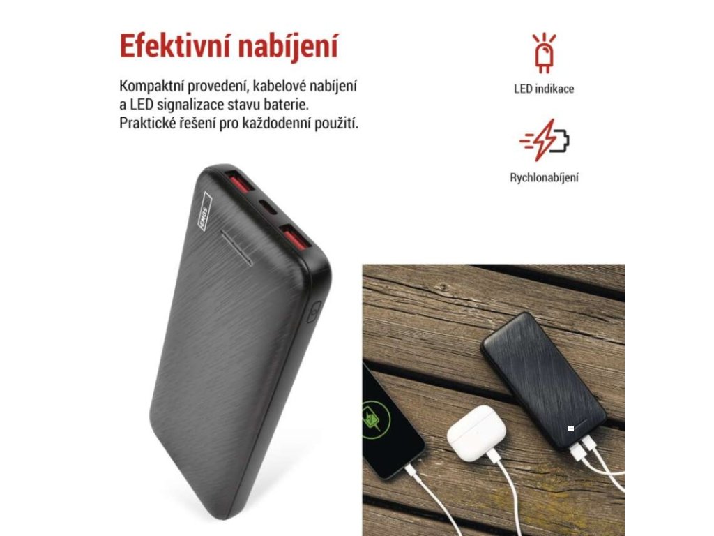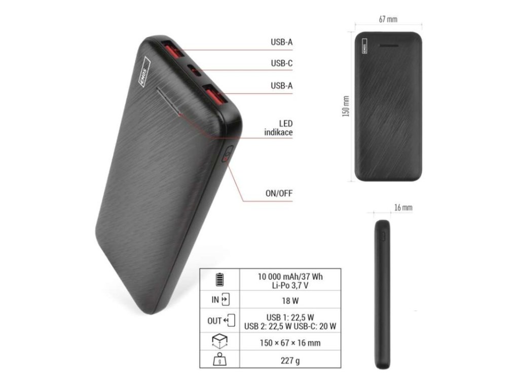 auto ON/OFF: ano|barva: černá|doba nabíjení: 3,5 hodiny|hmotnost: 227 g|kapacita akumulátoru: 10 000 mAh/37 Wh|LED indikátor nabíjení: ano|LED indikátor stavu baterie: ano|materiál: ABS plast|max. vstupní výkon: 18 W|max. výkon drátového nabíjení: 22,5 W|ochrana proti podbití: ano|ochrana proti přebití: ano|ochrana proti přetížení: ano|ochrana proti zkratu: ano|passthrough: ano|přibalený kabel: USB-A/USB-C|prodejní obal: 1 ks, plastová krabička|provozní teplota: 0 °C až +40 °C|rozměr: 150 × 67 × 16 mm|rychlé nabíjení: PD 20 W|typ akumulátoru: Li-Po 3,7 V|typ vstupního rozhraní: 1× USB-C|typ výstupního rozhraní: 2× USB-A, 1× USB-C|záruční doba: 2 rokyDoplňkové parametry