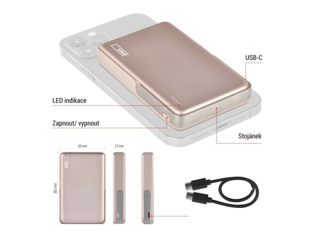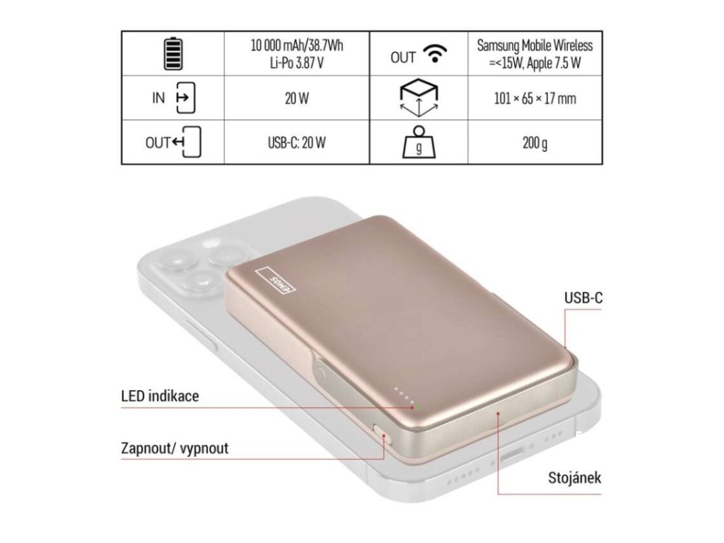 auto ON/OFF: ano|barva: rosegold|doba nabíjení: 2,5 hodiny|hmotnost: 200 g|kapacita akumulátoru: 10 000 mAh/38,7 Wh|LED indikátor nabíjení: ano|LED indikátor stavu baterie: ano|materiál: hliník|max. vstupní výkon: 18 W|max. výkon drátového nabíjení: 20 W|ochrana proti podbití: ano|ochrana proti přebití: ano|ochrana proti přetížení: ano|ochrana proti zkratu: ano|passthrough: ano|přibalený kabel: USB-C/USB-C|prodejní obal: 1 ks, papírová krabička|provozní teplota: 0 °C až +40 °C|rozměr: 101 × 65 × 17 mm|rychlé nabíjení: PD 20 W|typ akumulátoru: Li-Po 3,87 V|typ vstupního rozhraní: 1× USB-C|typ výstupního rozhraní: 1× USB-C|záruční doba: 2 rokyDoplňkové parametry