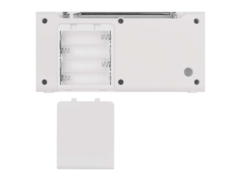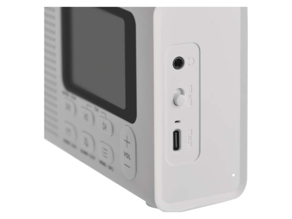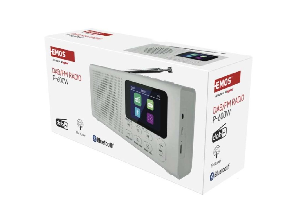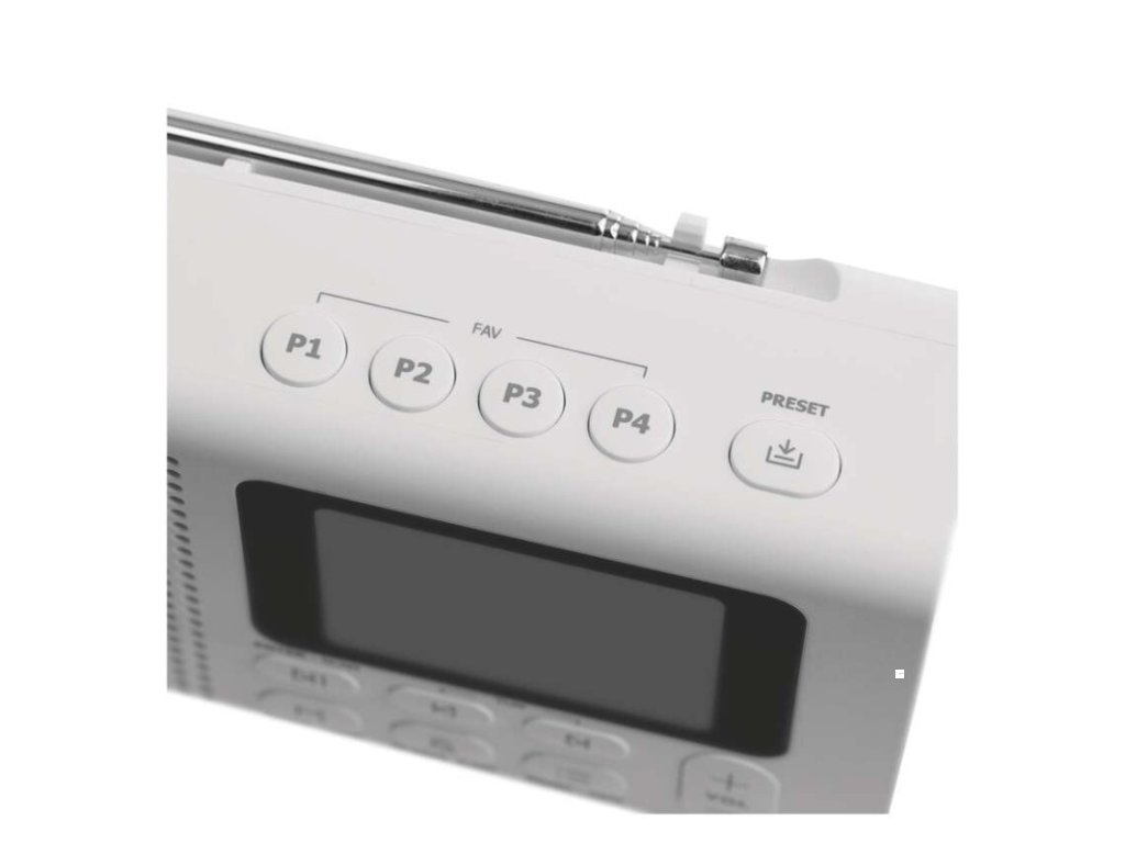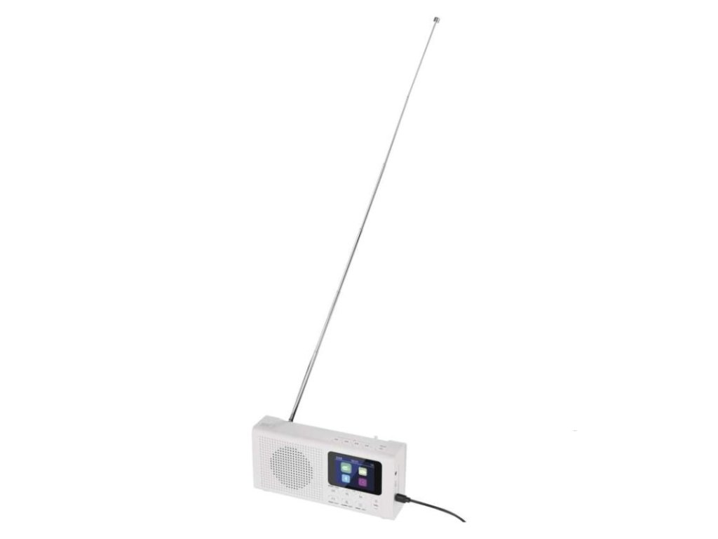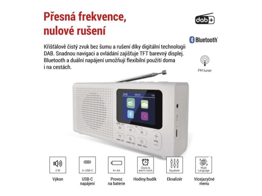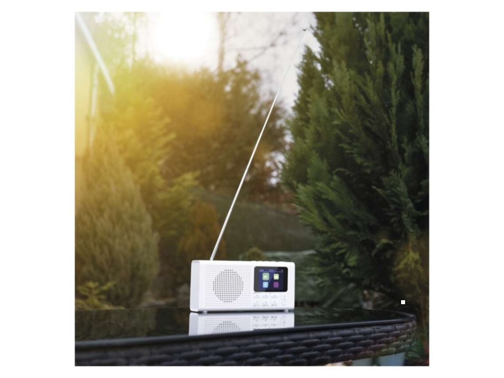 anténa: teleskopická s kloubem|barva: bílá|bluetooth pro připojení např. telefonu, tabletu: ano|displej: barevný displej 2,4" TFT|doba provozu na baterii: dle použitých baterií|dosah bluetooth: 10 m|frekvence tuneru: 87,5–108 Mhz/174,9–239,2 Mhz|frekvenční rozsah reproduktoru: neuvádí se|funkce budíku: ano|funkce handsfree: ne|hmotnost: 337 g|integrovaný mikrofon: ne|napájecí zdroj součástí dodávky: ano|napájení: 4× AA 1,5 V (tužka)|odstup signálu/šum: neuvádí se|podpora MP3: ne|potlačení signálu: neuvádí se|prodejní obal: 1 ks, krabice|rádio: DAB/DAB+/FM|reproduktor: 50 mm/4 Ohm/3 W|rozměr: 190 × 91 × 45 mm|rozsah dekodéru MP3: neuvádí se|typ baterie: AA (tužka)|USB vstup: ne|verze bluetooth: 5.0|vstup AUX: ne|vstup pro microSD kartu: ne|výstup na sluchátka: anoDoplňkové parametry
