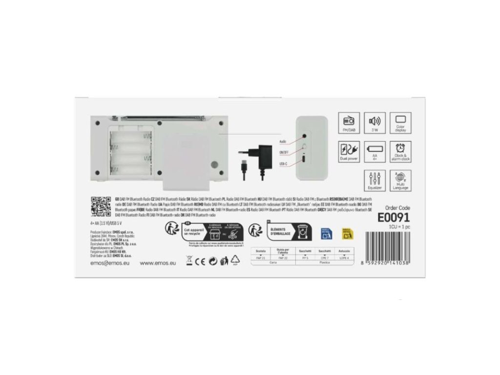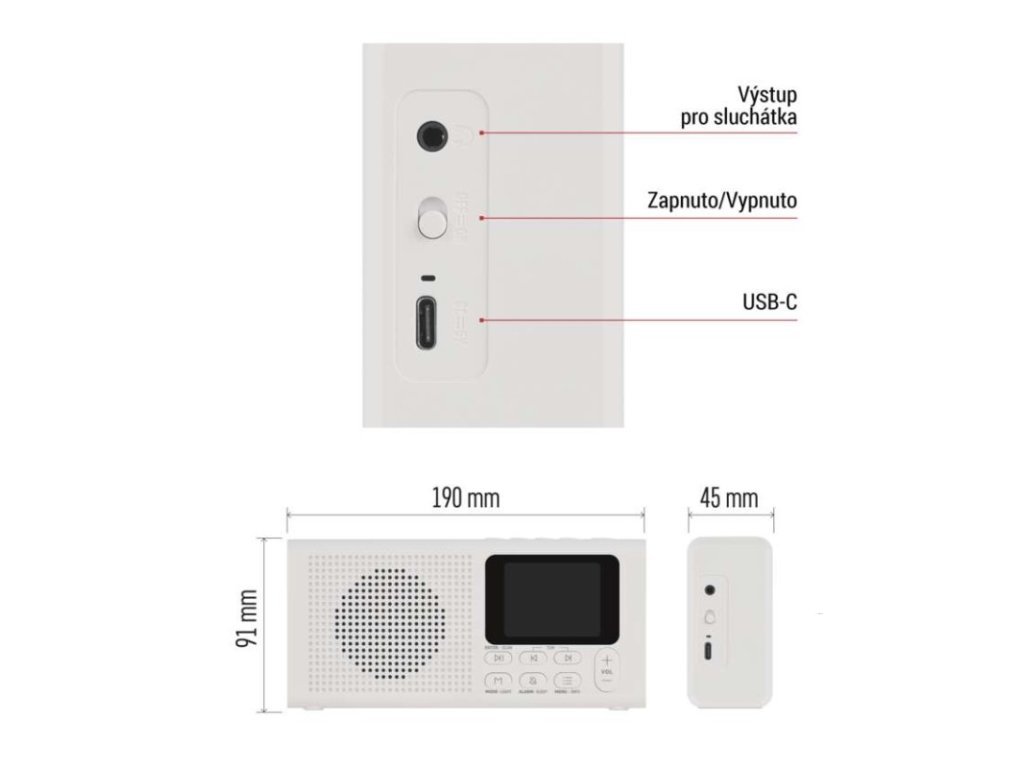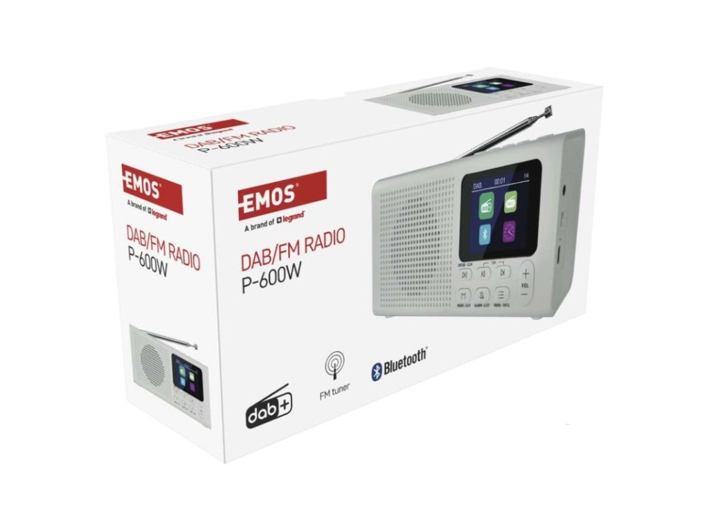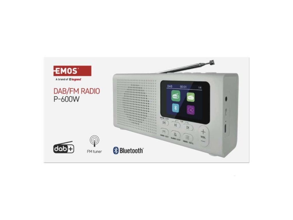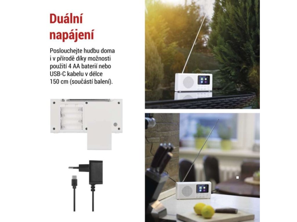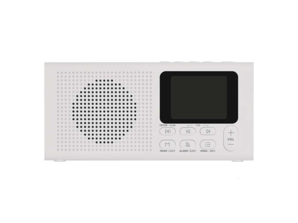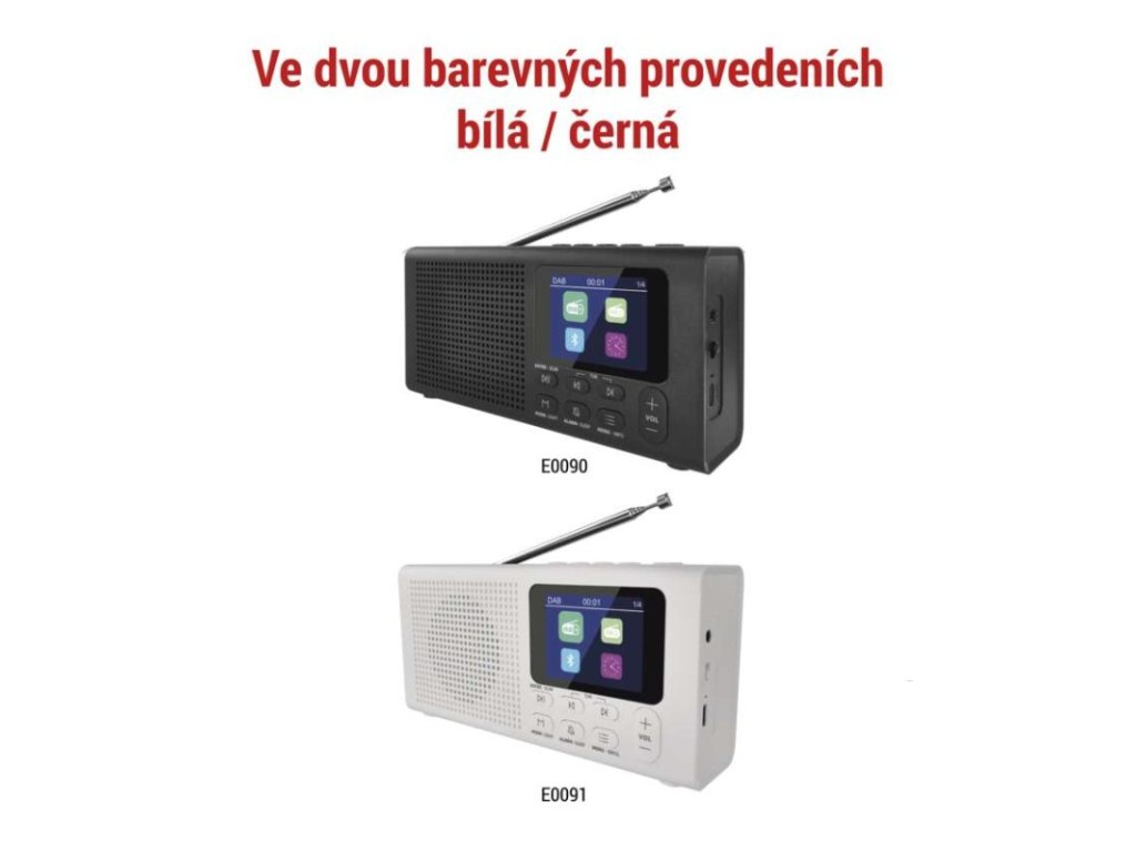 anténa: teleskopická s kloubem|barva: bílá|bluetooth pro připojení např. telefonu, tabletu: ano|displej: barevný displej 2,4" TFT|doba provozu na baterii: dle použitých baterií|dosah bluetooth: 10 m|frekvence tuneru: 87,5–108 Mhz/174,9–239,2 Mhz|frekvenční rozsah reproduktoru: neuvádí se|funkce budíku: ano|funkce handsfree: ne|hmotnost: 337 g|integrovaný mikrofon: ne|napájecí zdroj součástí dodávky: ano|napájení: 4× AA 1,5 V (tužka)|odstup signálu/šum: neuvádí se|podpora MP3: ne|potlačení signálu: neuvádí se|prodejní obal: 1 ks, krabice|rádio: DAB/DAB+/FM|reproduktor: 50 mm/4 Ohm/3 W|rozměr: 190 × 91 × 45 mm|rozsah dekodéru MP3: neuvádí se|typ baterie: AA (tužka)|USB vstup: ne|verze bluetooth: 5.0|vstup AUX: ne|vstup pro microSD kartu: ne|výstup na sluchátka: anoDoplňkové parametry