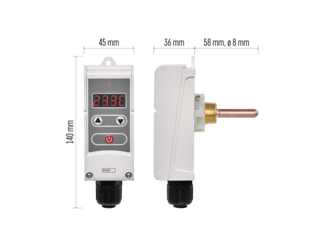 barva: bílá|délka kapilárového čidla: neuvádí se|dosah ve volném prostoru: neuvádí se|druh regulace: vytápěcí a chladící systém|funkce ON/OFF: ano|funkce prázdniny: ne|funkce Set-back: neuvádí se|kalibrace teploty: ne|měření teploty: 5 °C až 80 °C, rozlišení 0,1 °C|možnost propojení s dalšími detektory: neuvádí se|napájení: 230 V AC|napájení brány: neuvádí se|napájení přijímače: neuvádí se|napájení vysílače: neuvádí se|nastavení teploty: 5 °C až 80 °C, po 0,1 °C|nastavitelný rozptyl teploty: 0,1 °C až 15 °C, po 0,1 °C|ochrana proti zamrznutí: ne|počet programů: neuvádí se|podsvícený displej: ano|pracovní frekvence: neuvádí se|prodejní obal: 1 ks, krabička|protokol: –|rozměr: 45 × 36 × 140 mm, jímka: 58 mm, Ø 8 mm, závit 1/2"|rozměr brány: neuvádí se|rozměr přijímače: neuvádí se|rozměr vysílače: neuvádí se|součást balení: neuvádí se|spínaná zátěž: 5 A odporově, 1,5 A induktivně|spínání: napěťové 230 V AC, 50 Hz|typ nastavení teploty: manuálně|typ ovládání: manuální termostat|typ termostatu: drátový příložnýDoplňkové parametry