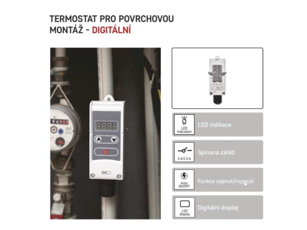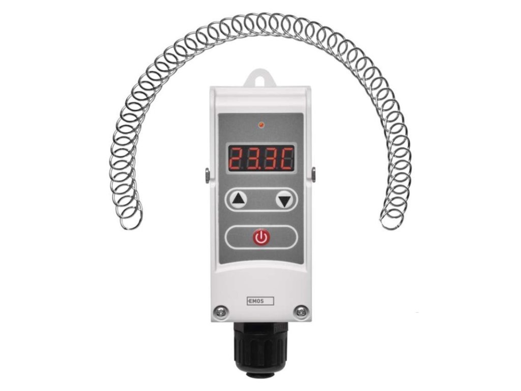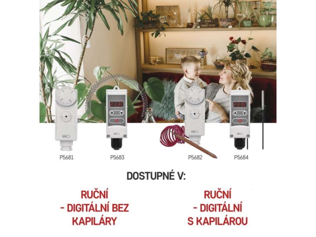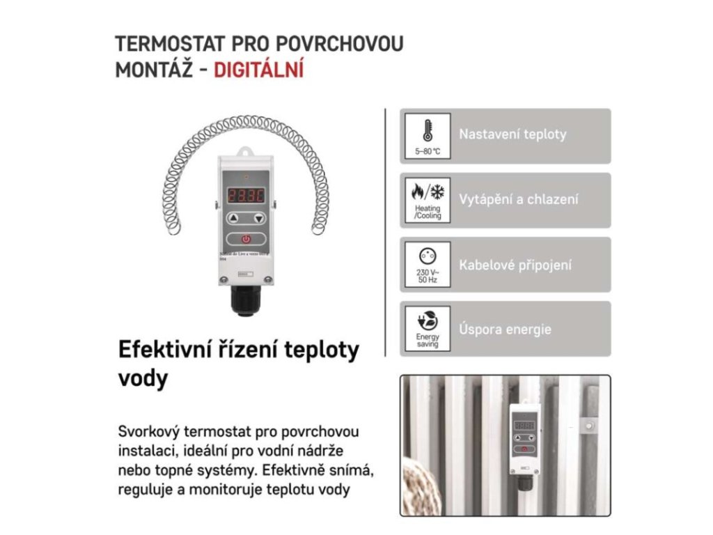 barva: bílá|délka kapilárového čidla: neuvádí se|dosah ve volném prostoru: neuvádí se|druh regulace: vytápěcí a chladící systém|funkce ON/OFF: ano|funkce prázdniny: ne|funkce Set-back: neuvádí se|kalibrace teploty: ne|měření teploty: 5 °C až 80 °C, rozlišení 0,1 °C|možnost propojení s dalšími detektory: neuvádí se|napájení: 230 V AC|napájení brány: neuvádí se|napájení přijímače: neuvádí se|napájení vysílače: neuvádí se|nastavení teploty: 5 °C až 80 °C, po 0,1 °C|nastavitelný rozptyl teploty: 0,1 °C až 15 °C, po 0,1 °C|ochrana proti zamrznutí: ne|počet programů: neuvádí se|podsvícený displej: ano|pracovní frekvence: neuvádí se|prodejní obal: 1 ks, krabička|protokol: –|rozměr: 41 × 50 × 138 mm|rozměr brány: neuvádí se|rozměr přijímače: neuvádí se|rozměr vysílače: neuvádí se|součást balení: neuvádí se|spínaná zátěž: 5 A odporově, 1,5 A induktivně|spínání: napěťové 230 V AC, 50 Hz|typ nastavení teploty: manuálně|typ ovládání: manuální termostat|typ termostatu: drátový příložnýDoplňkové parametry