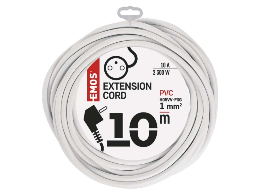 barva: bílá|délka: 10 m|dětské clonky: ano|krytí: IP20|materiál zásuvky a vidlice: plast|max. zátěž: 2 300 W|napětí: 250 V~|počet zásuvek: 1|prodejní obal: 1 ks, závěs|proud: 10 A max.|průřez vodiče: 1,0 mm²|typ izolace: PVC|USB výstup: ne|vodič: H05VV-F3G|vypínač: neDoplňkové parametry