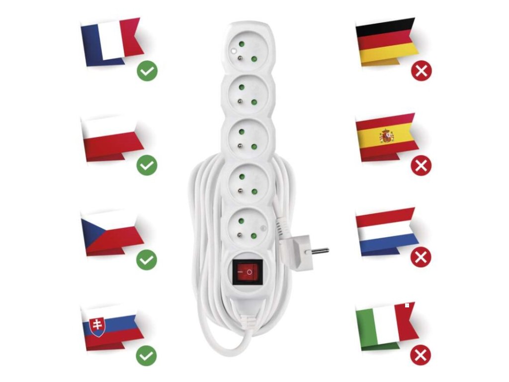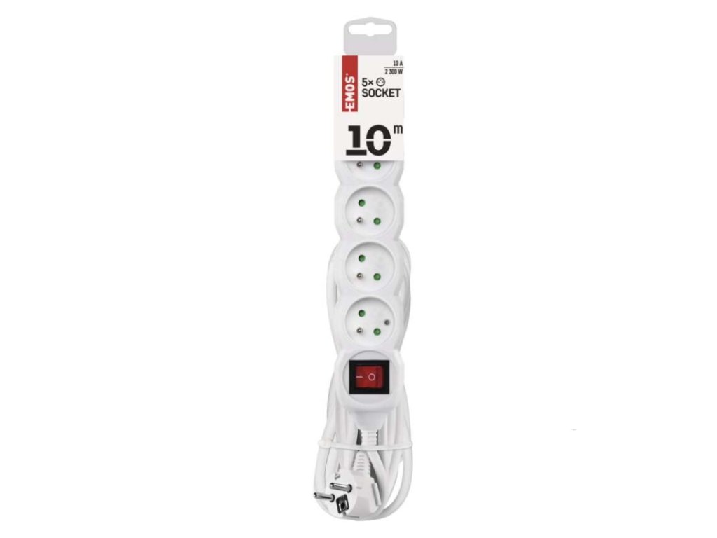 barva: bílá|délka: 10 m|dětské clonky: ano|krytí: IP20|materiál zásuvky a vidlice: plast|max. zátěž: 2 300 W|napětí: 250 V~|počet zásuvek: 5|prodejní obal: 1 ks, závěs|proud: 10 A max.|průřez vodiče: 1,0 mm²|typ izolace: PVC|USB výstup: ne|vodič: H05VV-F3G|vypínač: anoDoplňkové parametry