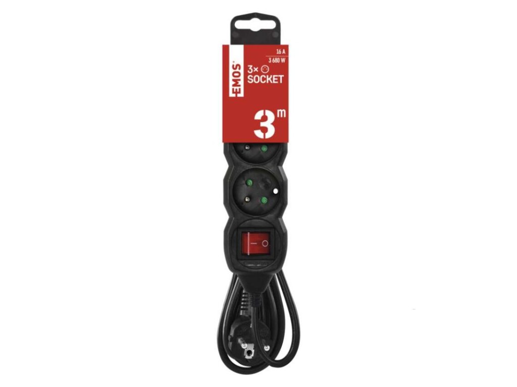 barva: černá|délka: 3 m|dětské clonky: ano|krytí: IP20|materiál zásuvky a vidlice: plast|max. zátěž: 3 680 W|napětí: 250 V~|počet zásuvek: 3|prodejní obal: 1 ks, závěs|proud: 16 A max.|průřez vodiče: 1,5 mm²|typ izolace: PVC|USB výstup: ne|vodič: H05VV-F3G|vypínač: anoDoplňkové parametry