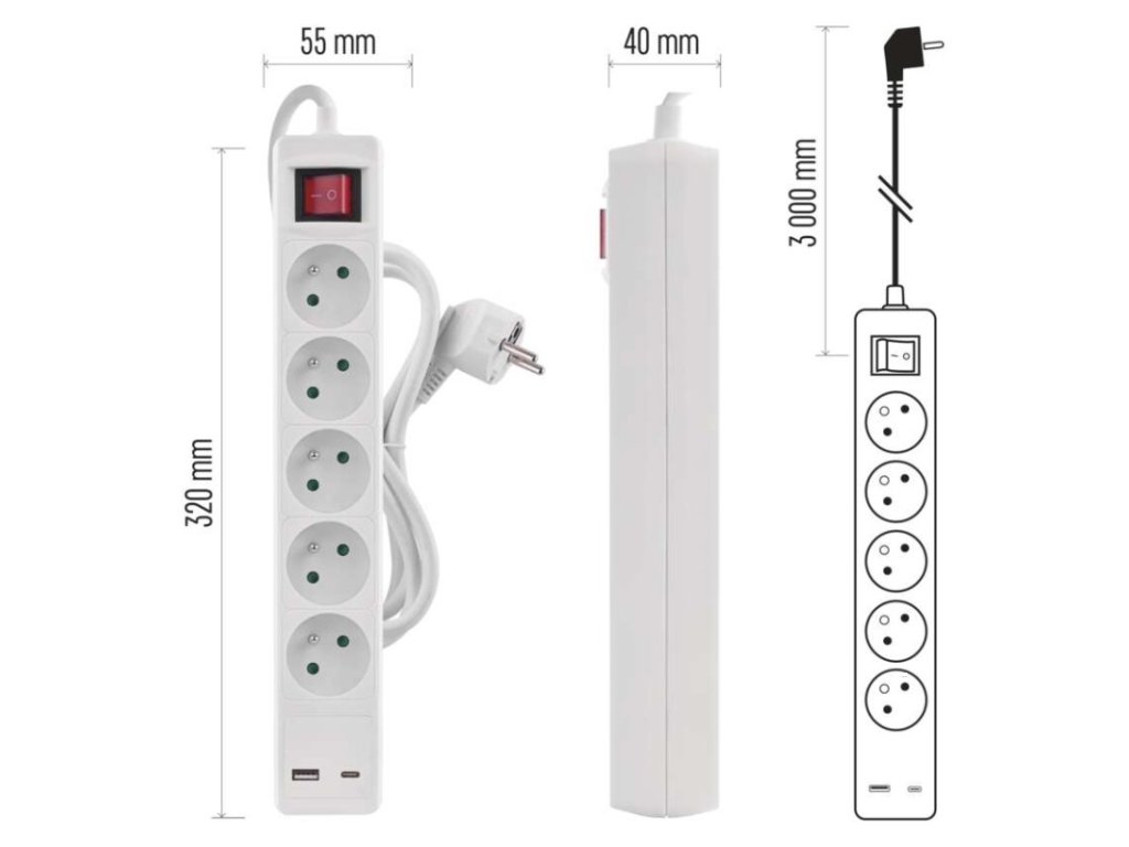 barva: bílá|další funkce: ne|délka: 3 m|dětské clonky: ano|jazyky aplikace: –|kompatibilita: –|krytí: IP20|materiál zásuvky a vidlice: plast|max. zátěž: 3 680 W|napětí: 250 V~|notifikace do mobilní aplikace: ne|ovládání hlasovými asistenty: ne|počet zásuvek: 5× 2P + PE|podporované OS: –|přenosová frekvence: –|prodejní obal: 1 ks, závěs|protokol: –|proud: 16 A max.|průřez vodiče: 1,5 mm²|typ izolace: PVC|USB výstup: 1× USB-A, 1× USB-C, total: 3,4 A – 17 W|vodič: H05VV-F3G|vypínač: anoDoplňkové parametry