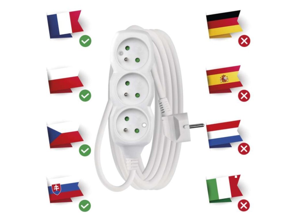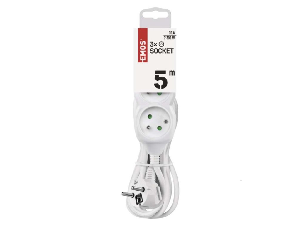 barva: bílá|délka: 5 m|dětské clonky: ano|krytí: IP20|materiál zásuvky a vidlice: plast|max. zátěž: 2 300 W|napětí: 250 V~|počet zásuvek: 3|prodejní obal: 1 ks, závěs|proud: 10 A max.|průřez vodiče: 1,0 mm²|typ izolace: PVC|USB výstup: ne|vodič: H05VV-F3G|vypínač: neDoplňkové parametry