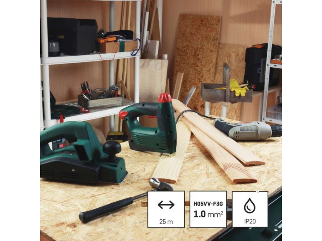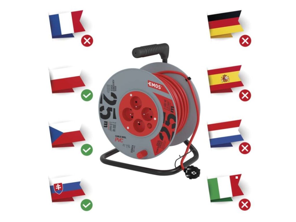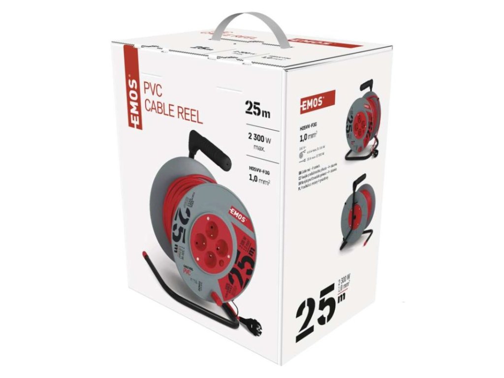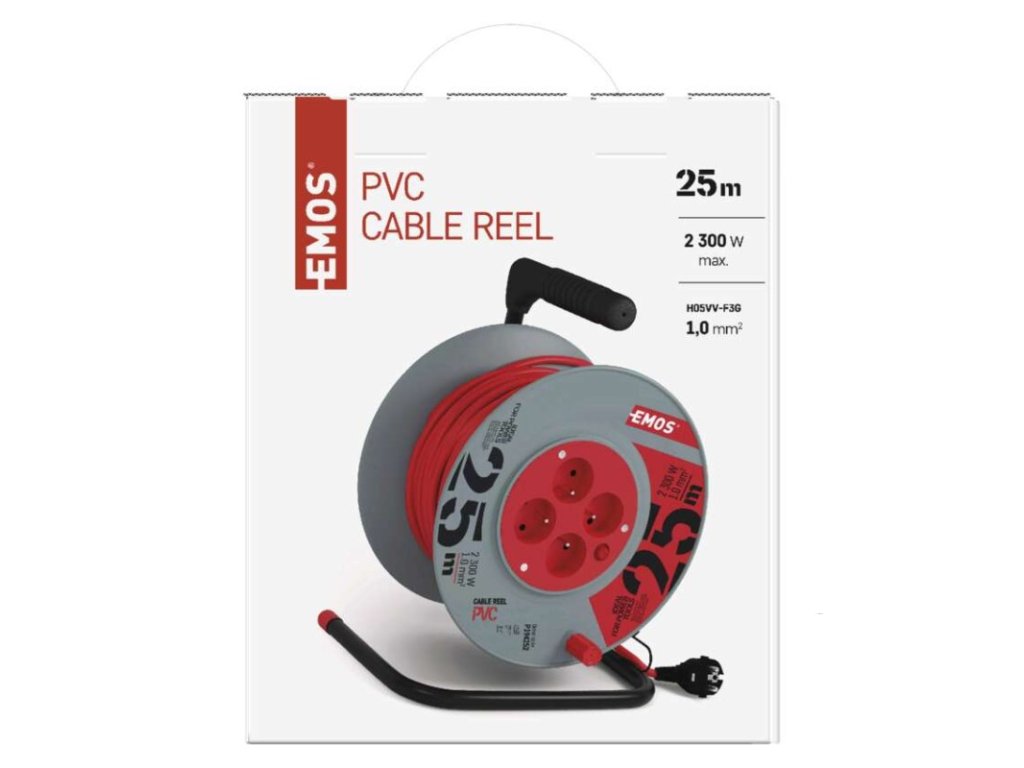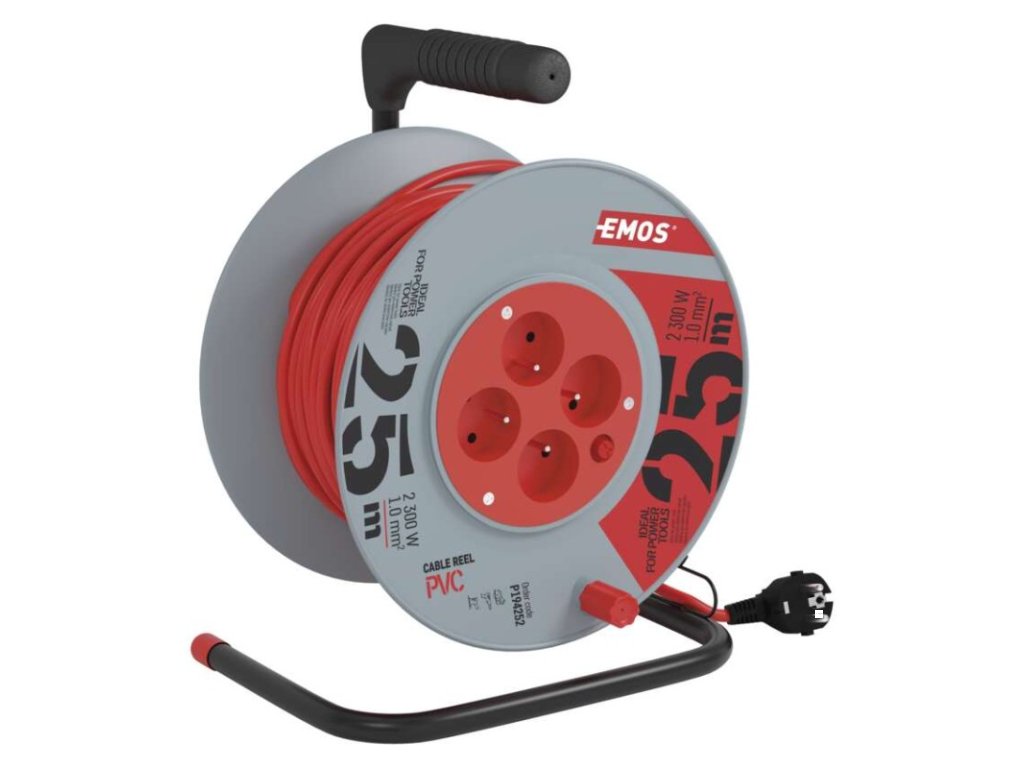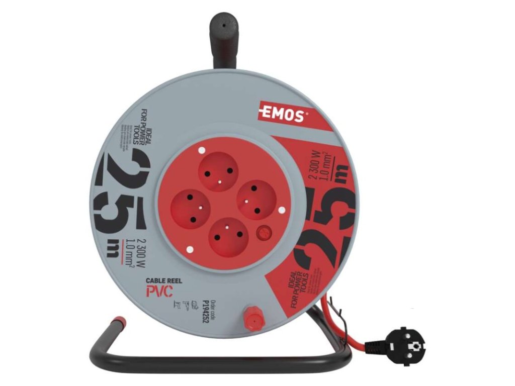 barva kabelu: červená|další funkce: vodící oko, brzda cívky|délka: 25 m|dětské clonky: ne|hmotnost: neuvádí se|krytí: IP20|max. zatížení navinutého: 4,8 A max./1 100 W|max. zatížení rozvinutého: 10 A max./2 300 W|napětí: 230 V~|počet zásuvek: 4|prodejní obal: 1 ks, krabice|produkt: buben s pohyblivým středem|proud: 10 A|průřez vodiče: 1,0 mm²|rozměr: 240 mm|tepelná pojistka: ano|typ izolace: PVC|vodič: H05VV-F3G|záruční doba: 2 rokyDoplňkové parametry