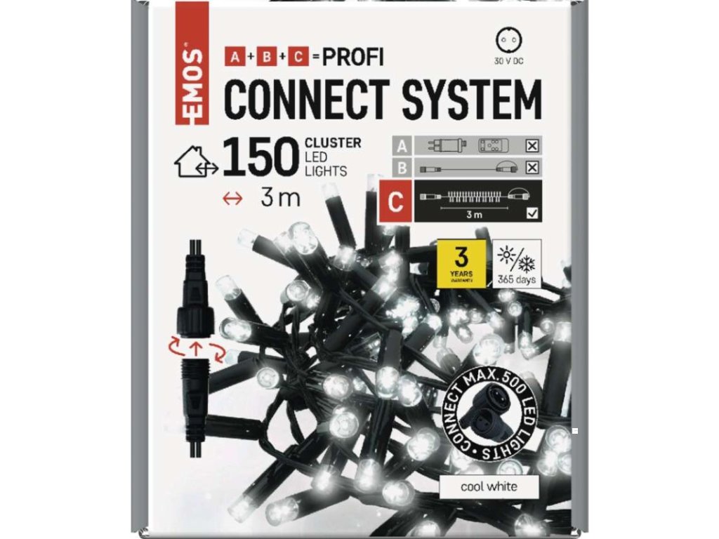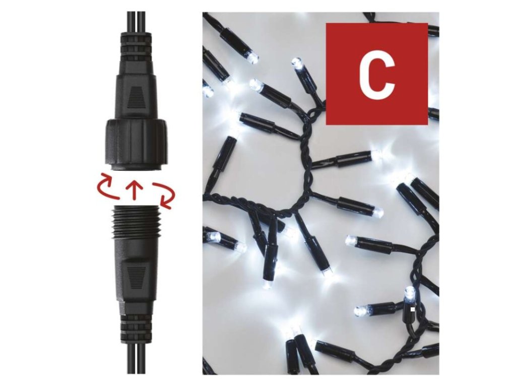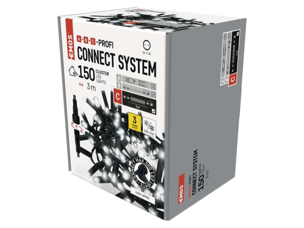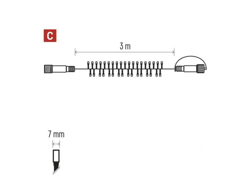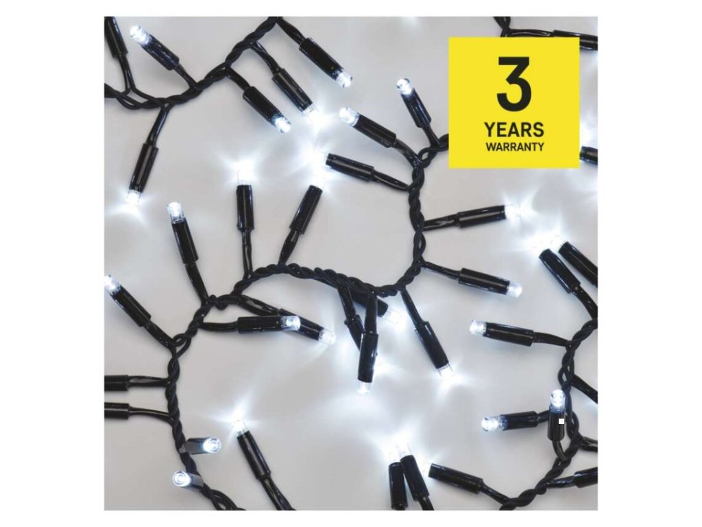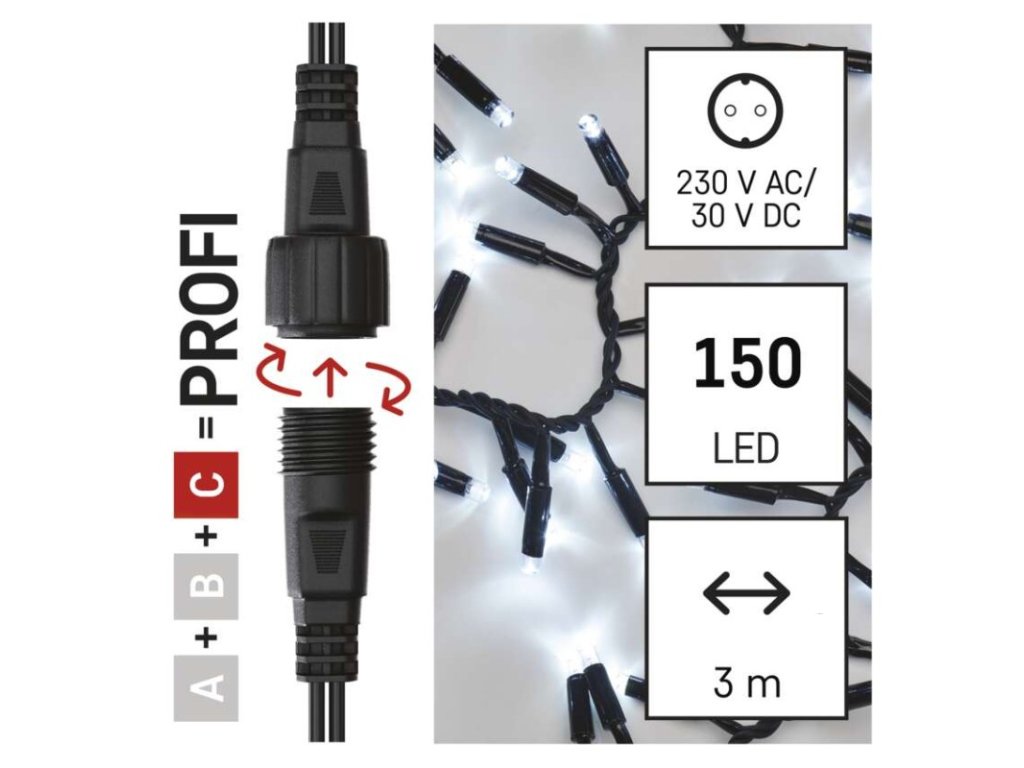 barva drátu: černá|barva světla: studená bílá|časovač: neuvádí se|dálkový ovladač: ne|délka přívodu: 10 cm|funkce: svítí|krytí: IP44|LED mezera: 2 cm|materiál: guma|možnost propojení: ano|počet LED: 150|použití: venkovní i vnitřní|příkon: max. 6 W|prodejní obal: 1 ks, krabice|produkt: řetěz|pro výšku stromu: neuvádí se|rozměr: 3 m|tvar: klasický|typ napájení: síťový adaptér (není součástí balení)|velikost LED: 7 mm|vstupní napětí: 30 V DC|výstupní napětí: neuvádí se|záruční doba: 3 roky|životnost: 10 000 hodinDoplňkové parametry