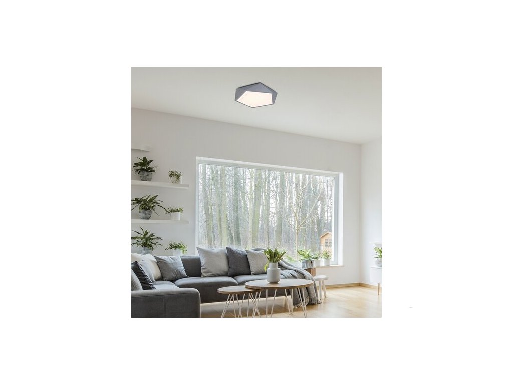 Velké stropní svítidlo Raffa v moderním stylu se doporučuje především do obývacího pokoje nebo ložnice. Tento základní pětiúhelníkový model v neutrálních barvách se hodí k mnoha moderním zařízením v domácnosti. Kovově šedou lampu doplňuje bílé plastové stínítko, zatímco design lampy Raffa je zajímavější díky hranatému tvaru těla lampy, které je na více místech zalomené. Svítilna má zabudovaný LED světelný zdroj energetické třídy G o výkonu 30 W, svítivostí 1000 lumenů se stínítkem, 1800 lumenů bez stínítka. Životnost světelného zdroje s teplotou barvy 3000 K je zcela mimořádná: Bude vám poskytovat teplé bílé světlo až 50 000 hodin. Tento typ světla pomáhá vytvořit v místnosti útulnou, domácí atmosféru a zároveň uvolňuje oči a je ideální pro relaxaci. Stropní svítidlo Raffa má průměr 400 mm a vzdálenost od stropu 80 mm.
