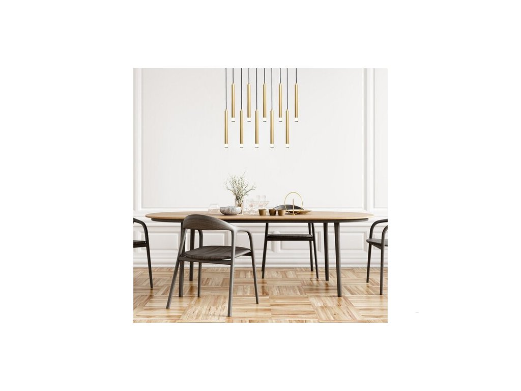 Závěsné svítidlo Rabalux Ramira s deseti žárovkami je primárně doporučeno těm, kteří hledají závěsné svítidlo v minimalistickém stylu, ale zároveň s působivými rozměry a vysokou světelnou intenzitou. Svítidlo je vyrobeno z kovu v elegantní zlaté barvě a doplněno průhlednými akrylovými stínidly a dlouhou čtvercovou dekorativní základnou ve stejné barvě jako světelné prvky. Světelné prvky mají malý průměr, trubicovitý, válcový tvar a jsou uspořádány vedle sebe v jedné řadě. Jsou zavěšeny v různých výškách, což tomuto modelu dodává jedinečný vzhled. Závěsné svítidlo je ideální nejen do obývacího pokoje, ale také do kuchyně, jídelny nebo ložnice. Lze jej použít s deseti žárovkami, každou o výkonu až 5 W. Typ objímky je G9. Svítidlo se dodává bez světelných zdrojů.