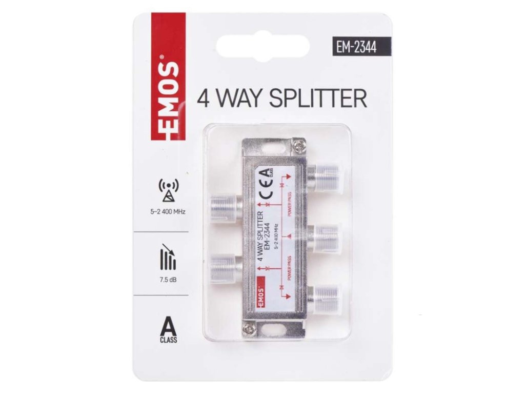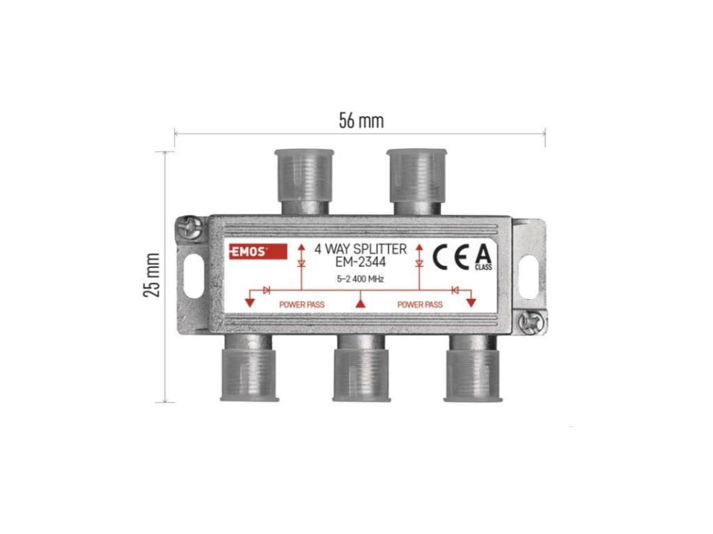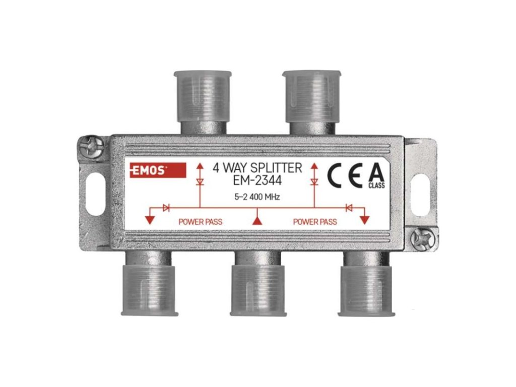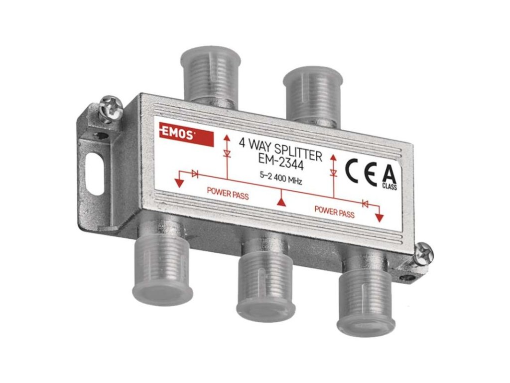 frekvenční rozsah: 5–2 400 MHz|krytí: IP20|materiál těla rozbočovače: zinkový odlitek|počet vstupů: 1|počet výstupů: 4|použití: TV + R + SAT|pracovní teplota: -10–+65 °C|prodejní obal: 1 ks, krabice|provedení: feritový|průchozí pro stejnosměrné napětí (power pass): ano, 4×|průchozí útlum: 7,5 dB|rozměr: 20 × 56 × 25 mm|tlumení odrazu na vstupu: neuvádí se|typ konektorů: F|zvlnění v pásmu: neuvádí seDoplňkové parametry