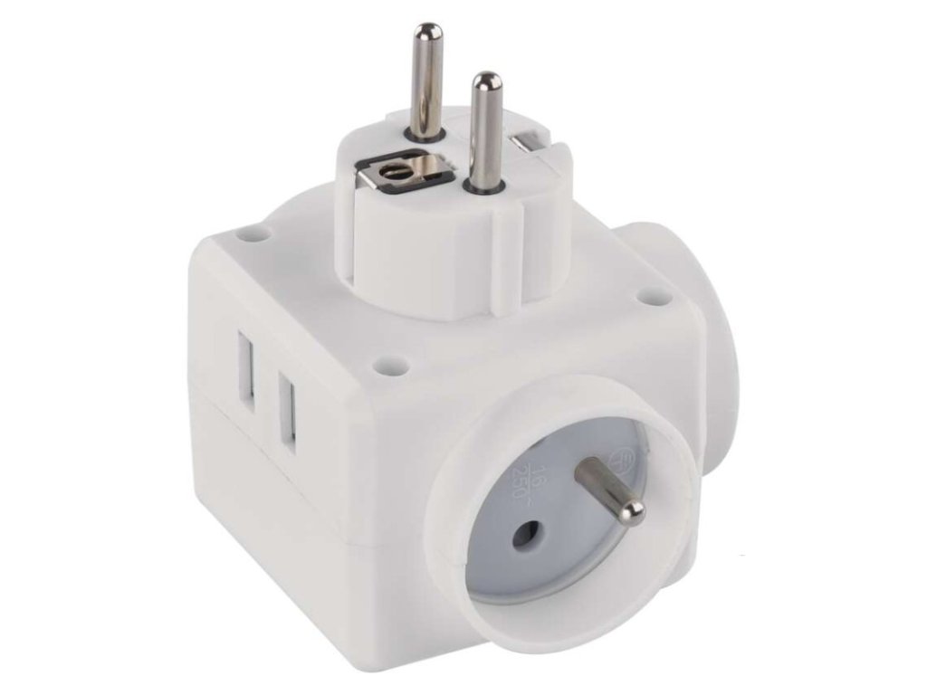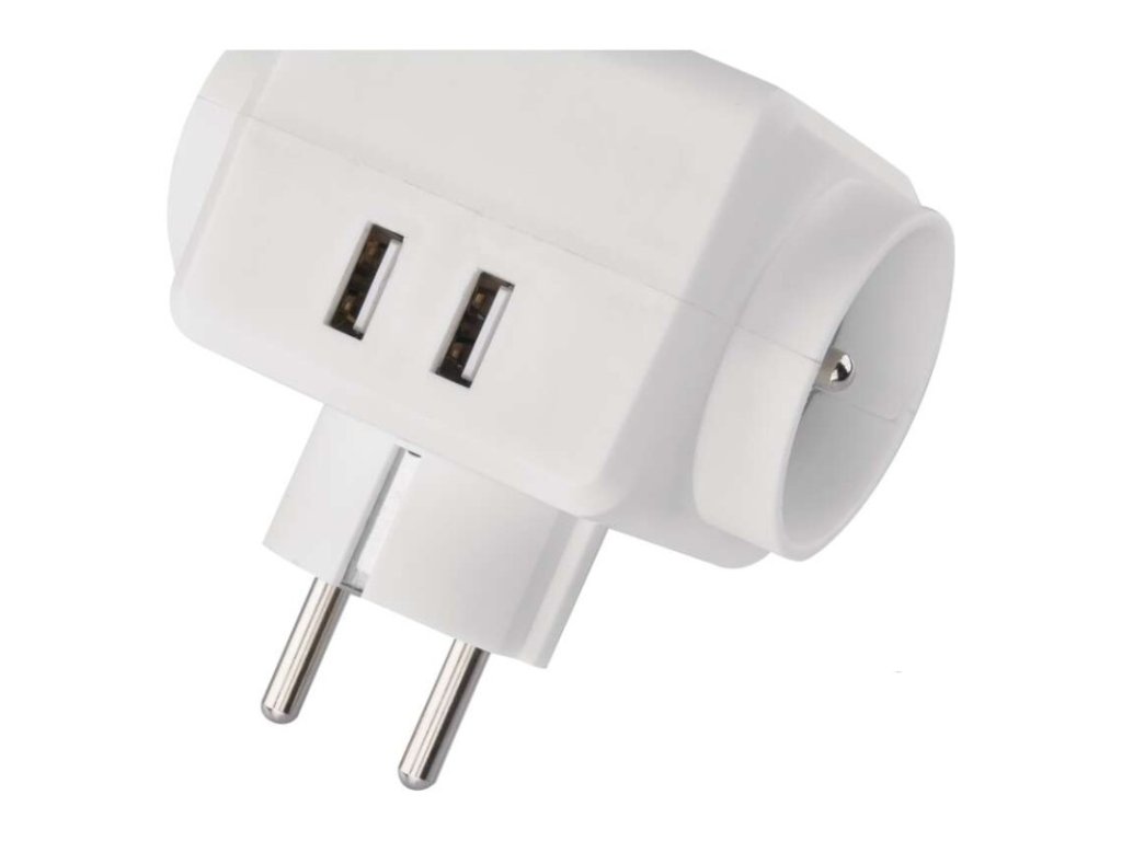 barva: bílá|dálkový ovladač: ne|dětské clonky: ano|dosah signálu: neuvádí se|easy learning: ne|krytí: IP20|materiál: plast|max. zátěž: 3 680 W|možnost ovládání: ne|napětí/proud: 250 V~/16 A max.|počet pólů: neuvádí se|počet zásuvek: 3× 2P + PE|pozice ochranného kontaktu: neuvádí se|přenosoná frekvence: neuvádí se|prodejní obal: 1 ks, závěs|produkt: rozbočovací zásuvka 3×+ 2× USB ∑2,4 A max.|typ: FRENCH|venkovní použití: ne|vypínač: neDoplňkové parametry