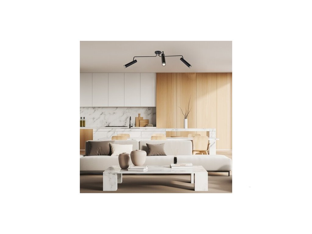 Moderní trojité stropní svítidlo Senobia může být dominantním kusem nábytku v obývacím pokoji, ložnici nebo pracovně. Lampa je vyrobena z hliníku v černé barvě a lze ji připevnit na strop pomocí malého kulatého ozdobného podstavce. Válcové hlavice s malým průměrem jsou namontovány na koncích ramen upevněných na podstavci a jsou doplněny bílými akrylovými stínítky. Ramena, která drží hlavy lampy, směřují každé jiným směrem a úhel hlav lampy lze nastavit v rozmezí 90° až 180°, takže světlo můžete nasměrovat podle svých představ. Lampu Senobia lze používat se dvěma světelnými zdroji každý s maximálním příkonem do 35 W, typ patice GU10. Můžete si vybrat mezi zdroji teplého nebo přirozeného bílého světla. Rozměry svítidla Senobia jsou tyto: šířka 1000 mm, průměr každého stínítka 55 mm, délka 150 mm, vzdálenost svítidla od stropu 485 mm, instalační průměr 120 mm. Trojité stropní svítidlo Senobia se dodává bez světelných zdrojů.