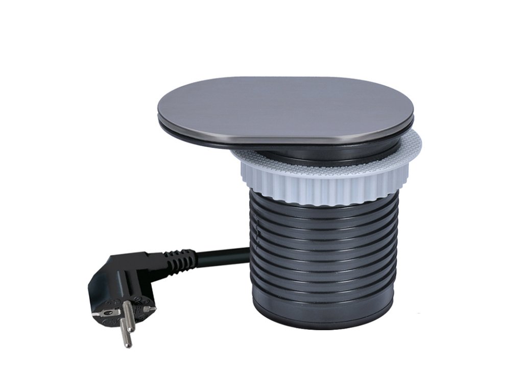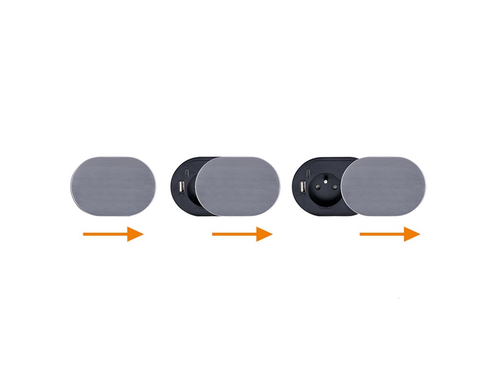 Posuvné víčko v matném nerez provedení působí elegantně a nenápadně. Posuvný mechanismus chrání zásuvku i nabíjecí porty před prachem a nečistotami. Navíc lze odhalit jen USB porty a síťovou zásuvku ponechat zakrytou. Zakryté víčko zachovává čistý vzhled pracovní plochy.