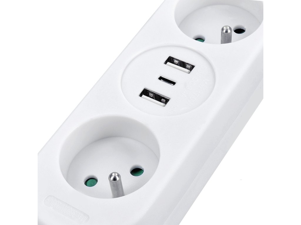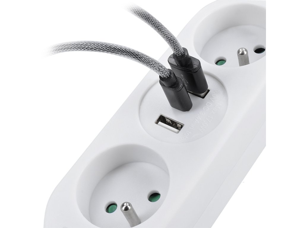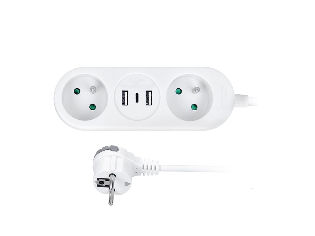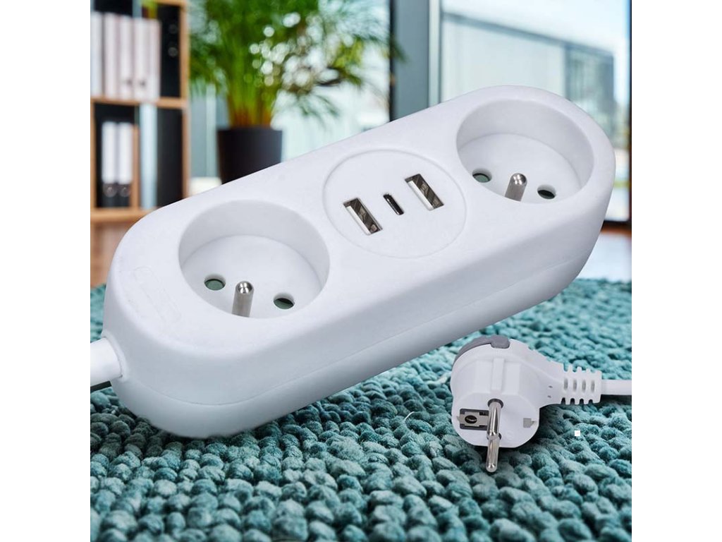 Prodlužovací napájecí kabel se dvěma zásuvkami a USB nabíječkou. Skladný, výkonný, lehce přenosný. Ideální pro nabíjení elektronických zařízení na cestách.