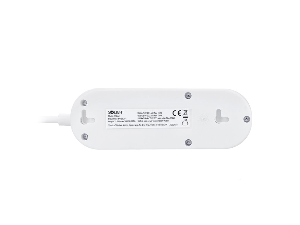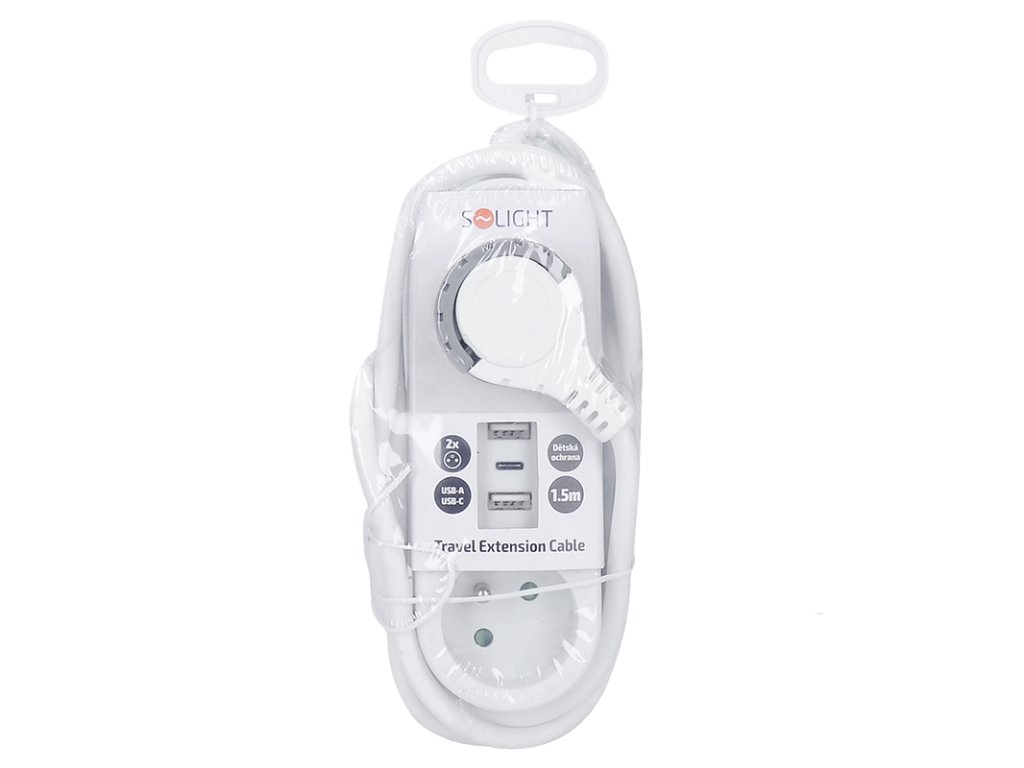 Solight 2z + USB A+C 17W, cestovní prodlužovací přívod 1.5m, bílý