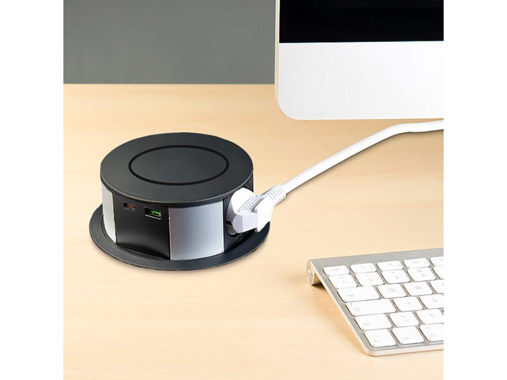 Tento výsuvný blok zásuvek přináší vše potřebné pro moderní pracovní plochu. Tři síťové zásuvky 230V, USB-A a USB-C porty s rychlým nabíjením a integrovaná bezdrátová Qi nabíječka s výkonem až 10 W tvoří kompaktní řešení pro každodenní používání. Stříbrné provedení vrchního krytu elegantně zapadne do pracovního stolu, kuchyňské linky nebo konferenční místnosti.