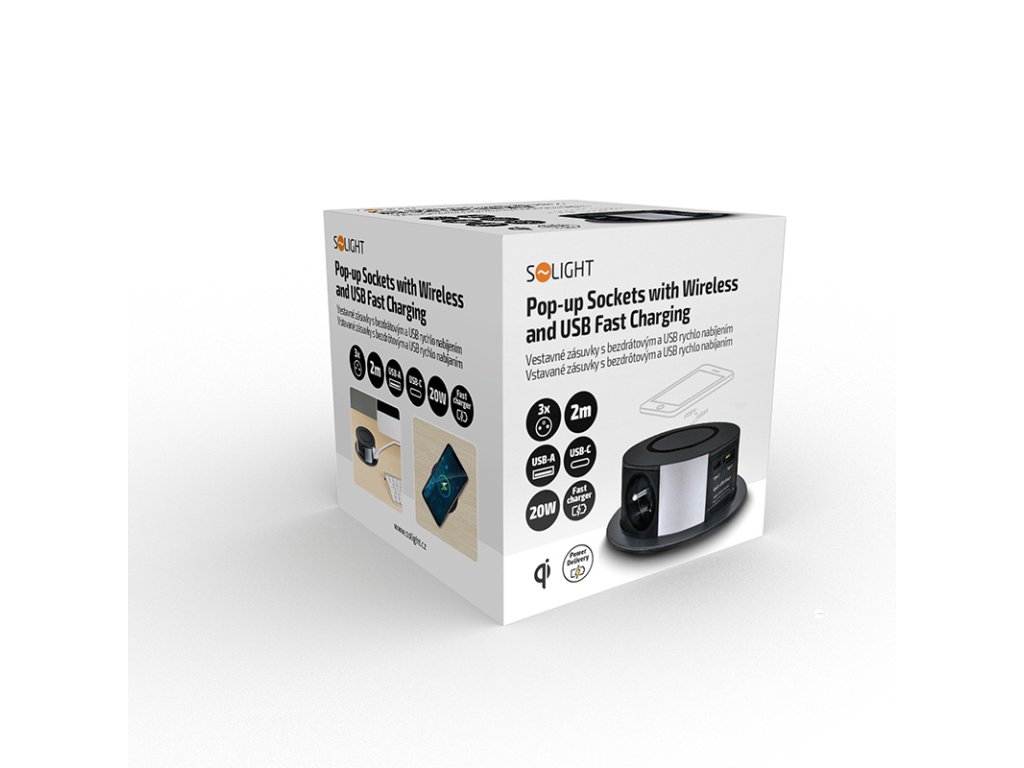 Solight 3z + USB A+C 20W PD, Wireless 10W, výsuvný blok zásuvek, 2m, černý