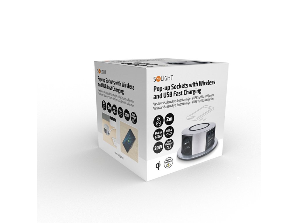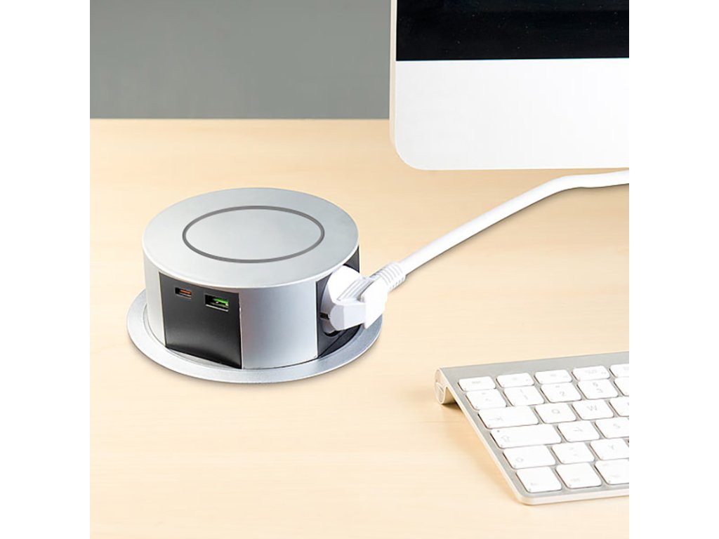 Tento výsuvný blok zásuvek přináší vše potřebné pro moderní pracovní plochu. Tři síťové zásuvky 230V, USB-A a USB-C porty s rychlým nabíjením a integrovaná bezdrátová nabíječka s výkonem až 10 W tvoří kompaktní řešení pro každodenní používání. Stříbrné provedení vrchního krytu elegantně zapadne do pracovního stolu, kuchyňské linky nebo konferenční místnosti.