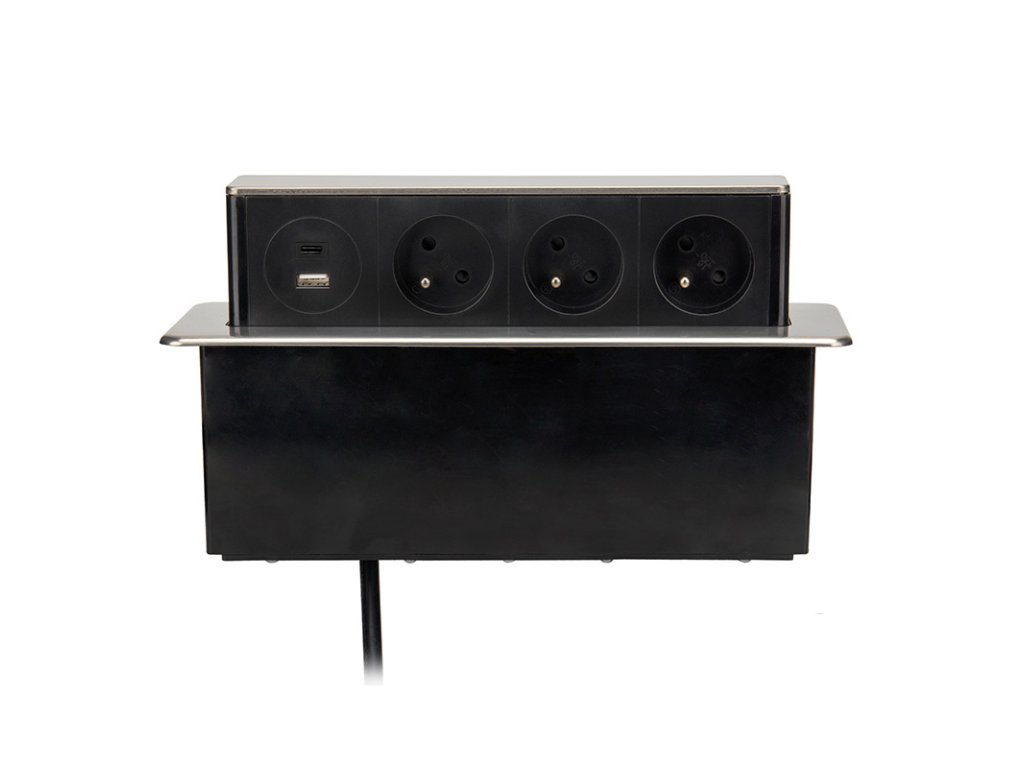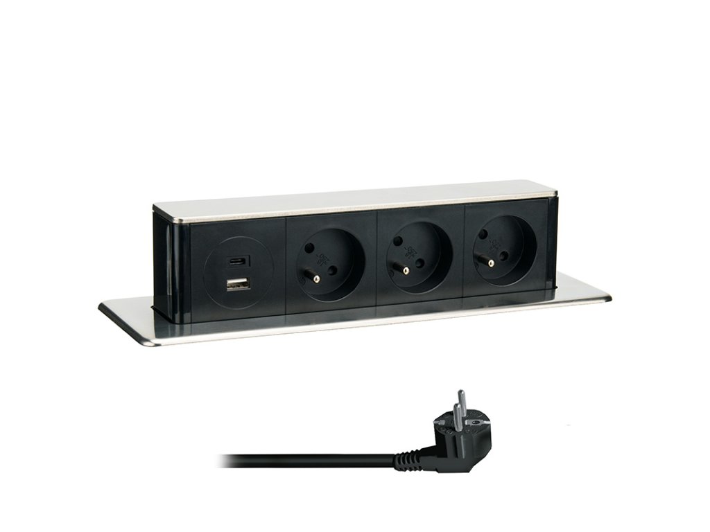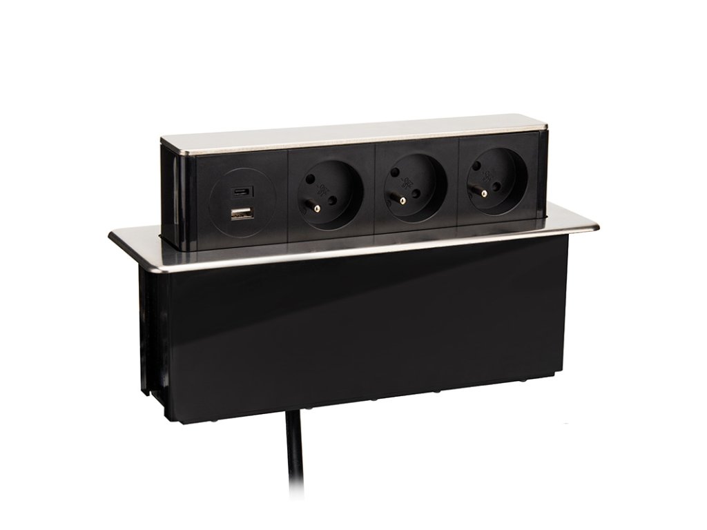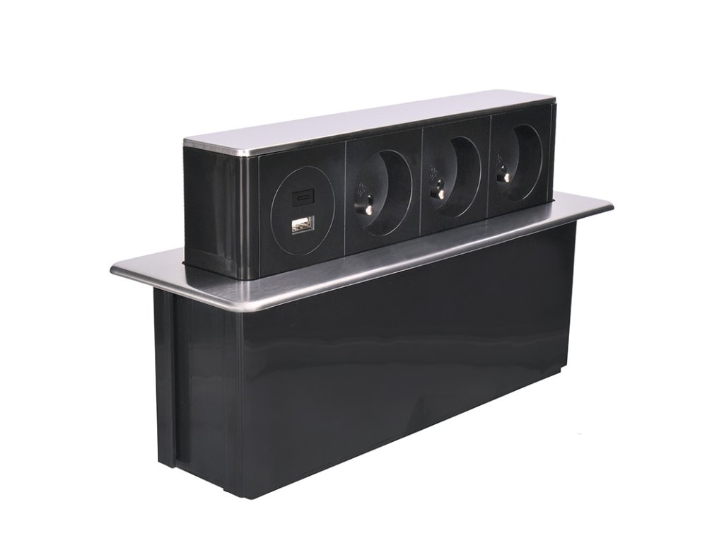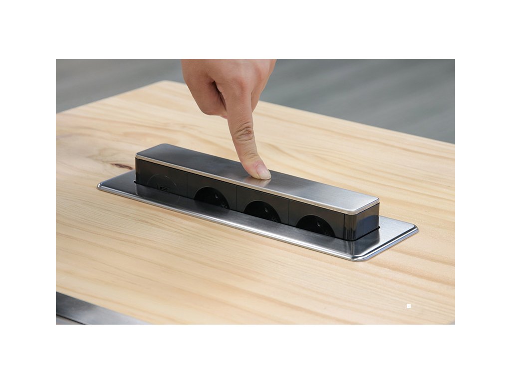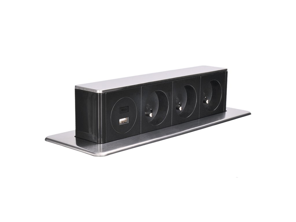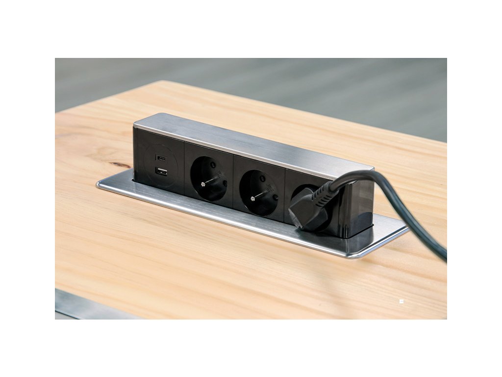 Výsuvný blok se zásuvkami je praktickým doplňkem pro pracovní desky a stoly, který umožňuje snadný přístup k elektrickým přípojkám pouze tehdy, když je to potřeba. Díky tomu šetří místo a udržuje pracovní plochu přehlednou. Vrchní kryt z nerezové oceli ve stříbrné barvě dodává moderní vzhled a zajišťuje odolnost vůči každodennímu používání.