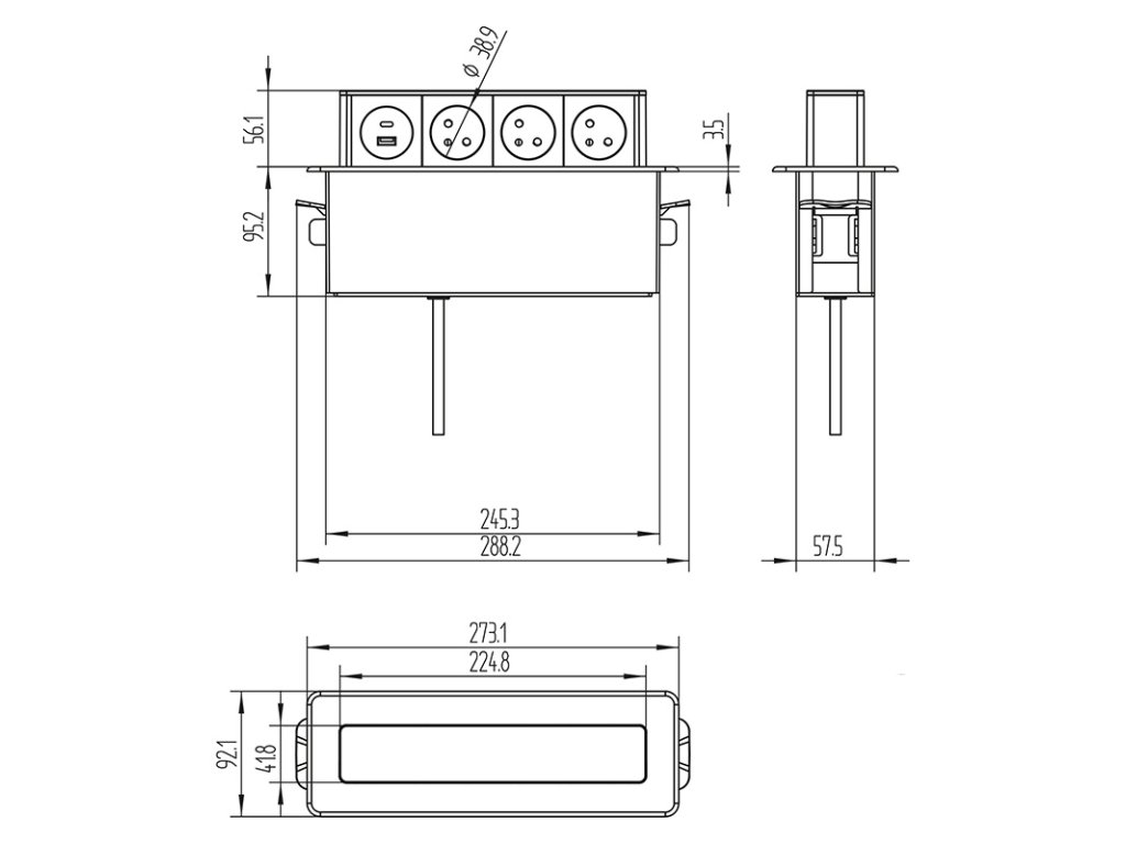 Součástí bloku je PVC kabel s délkou 2 metry a úhlovou vidlicí s nízkým profilem. Pro montáž je nutný otvor o rozměru 246 × 58 mm. Výsuvný mechanismus blokuje ve vysunuté poloze 60 mm nad deskou a pod deskou zabírá 94 mm.
