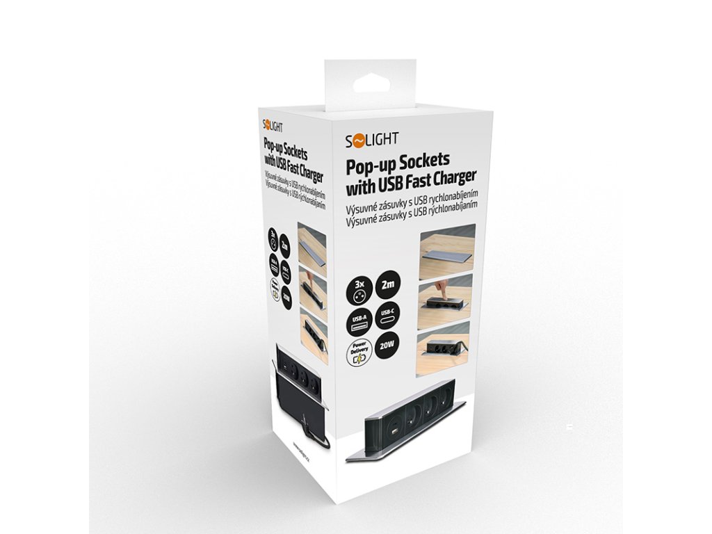 Solight 3z + USB A+C 20W PD výsuvný blok zásuvek, 2m, nerez ocel