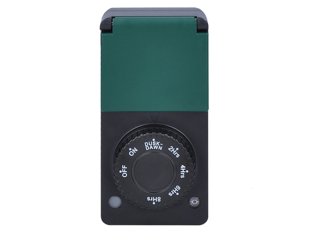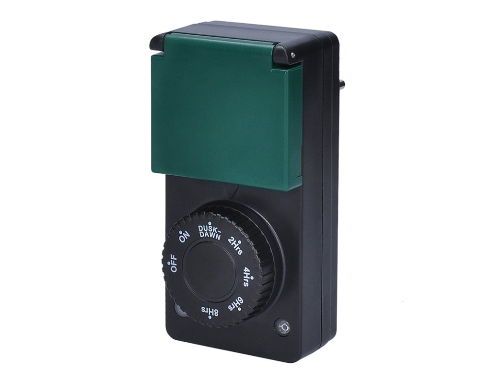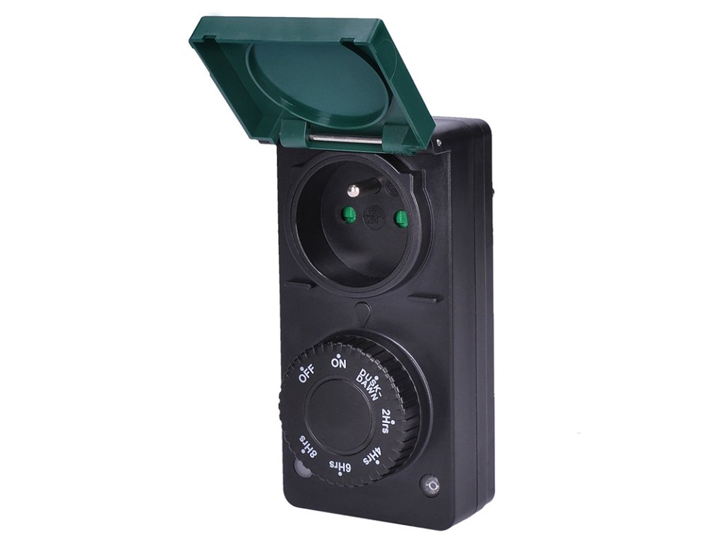 Tento analogově řízený časový spínač se soumrakovým čidlem slouží k automatickému zapínání a vypínání zařízení. Nabízí šest provozních režimů: ON, soumrakový senzor, 2 h, 4 h, 6 h a 8 h. Soumrakový senzor umožňuje ovládat zařízení podle západu a východu slunce. Pracuje s napětím 230V, maximální proud činí 16A a maximální zatížení 3600W. Má stupeň krytí IP44 a je vhodný pro provoz v teplotách od -10°C do 40°C. Černé provedení.