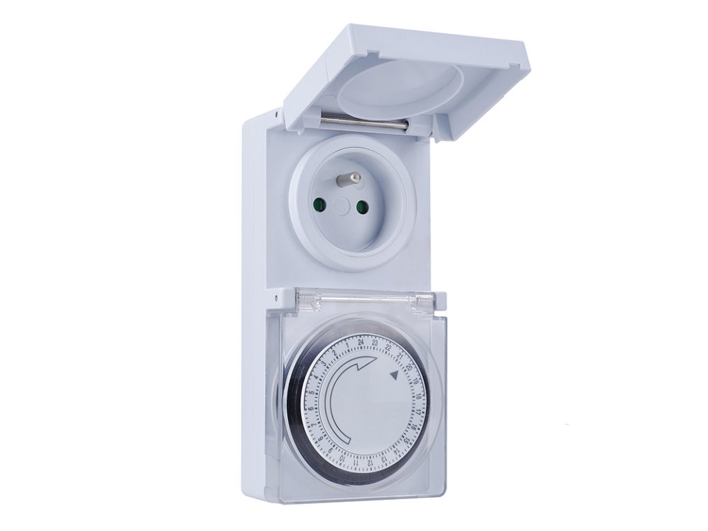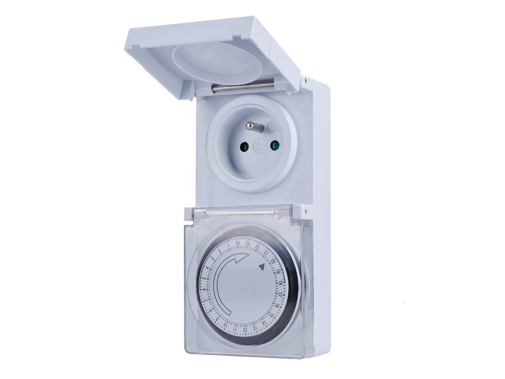 Tento mechanický časovač nabízí 24hodinové nastavení s minimálním časovým úsekem 15 minut. Disponuje dětskou pojistkou a pracuje na napětí 230V/16A, 50Hz. Má kryt zásuvky s gumovým těsněním a poskytuje voděodolnou ochranu na úrovni IP44.