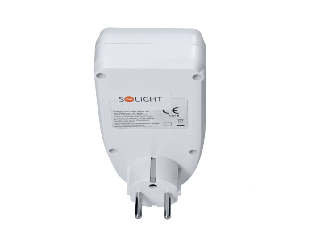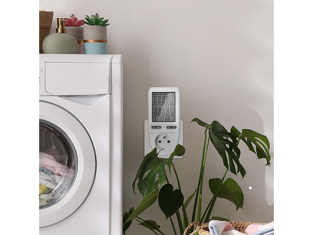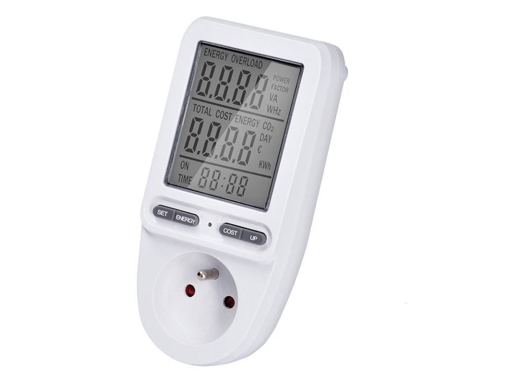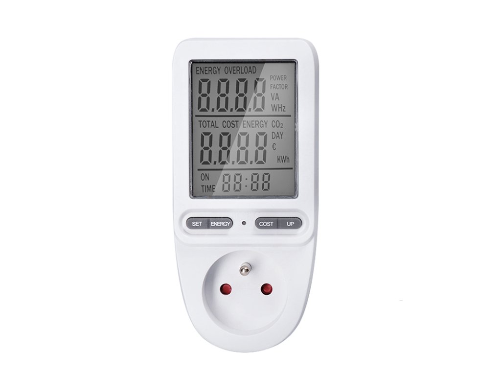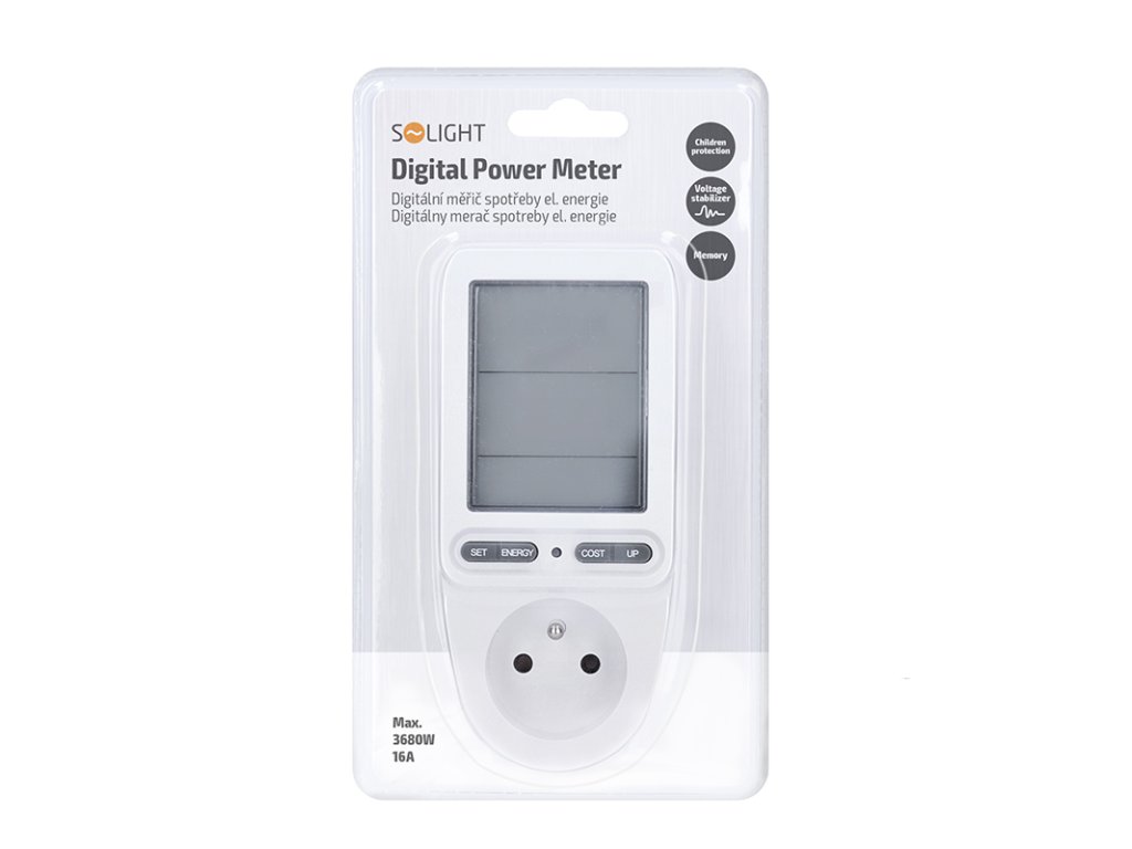 Měřič spotřeby elektrické energie s velkým LCD displejem o úhlopříčce 3" (7,5 cm) umožňuje měření spotřeby až do 9999 kWh a měření doby provozu až 9999 dní. Zaznamenává příkon v rozmezí 2W až 3680W/16A a uchovává naměřené hodnoty díky zabudované baterii. Nabízí možnost nastavení ceny za energii, přesný výpočet nákladů a měření spotřeby. Disponuje 4 tlačítky pro snadnou obsluhu, dětskou pojistkou a indikací překročení maximálního příkonu. Měří elektrické veličiny jako proud, napětí, frekvenci a okamžitý odebíraný výkon. Integrovaný stabilizátor napětí zajišťuje přesnost měření s odchylkou do ±1,5 %. Pracovní teplota se pohybuje mezi 0 až +50 °C. Napájení je AC 230V, 50Hz.
