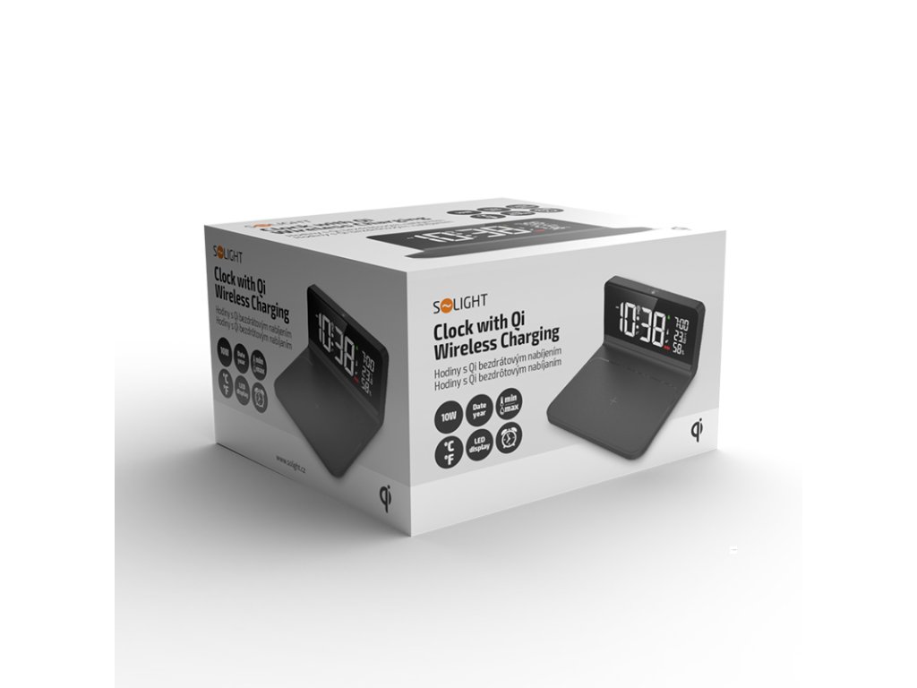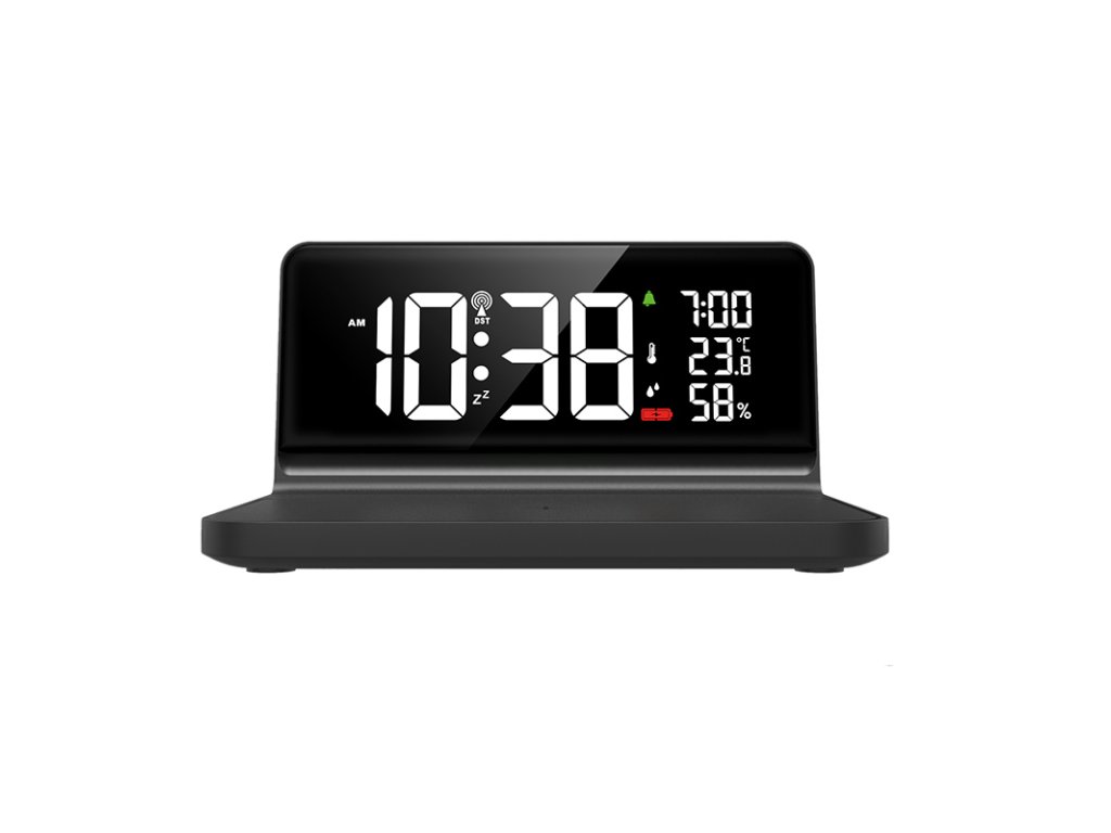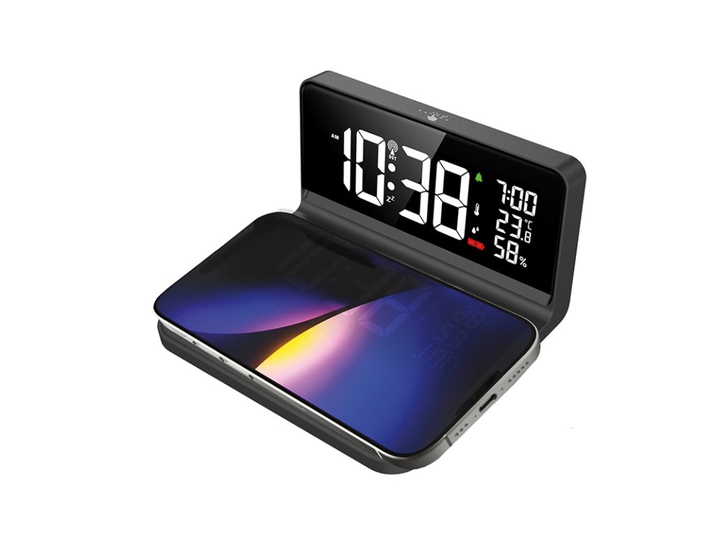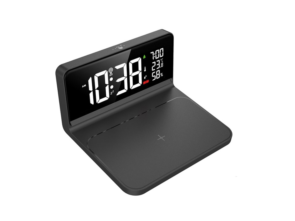 Budík a hodiny s bezdrátovým nabíjením – moderní multifunkční doplněk. Tento digitální budík kombinuje bezdrátovou nabíječku (Qi, max. 10W), hodiny, kalendář do roku 2099 a teploměr s měřením vlhkosti. Nabízí vysoké rozlišení LCD displeje, možnost zobrazení času ve formátu 12/24h, a denní i Po-Pá budík s funkcí opakovaného buzení. Měří teplotu (-9,9°C až +50°C) a vlhkost (20–95%). Pro rychlé nabíjení je nutný standard QC 3.0.