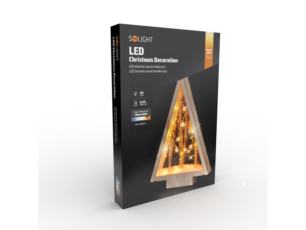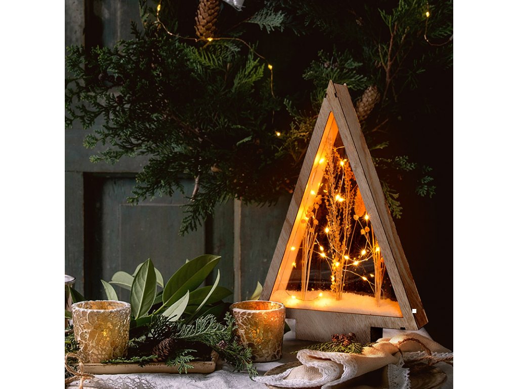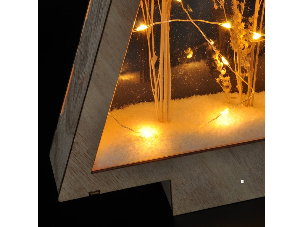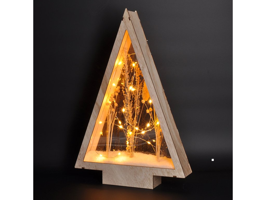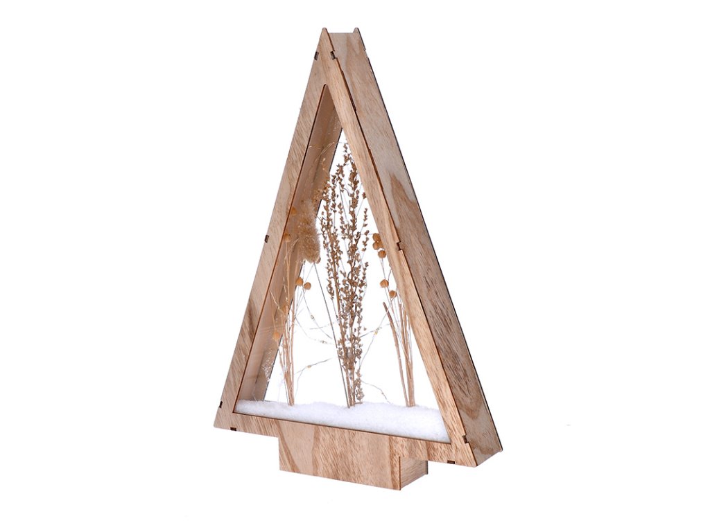 - přírodní, vánoční dřevěná dekorace ve tvaru vánočního stromku se zasněženými zimními květinami, podsvícené tenkým LED řetízkem