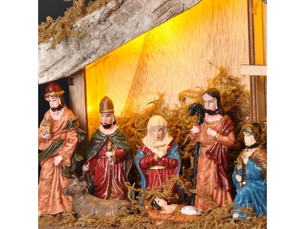 Betlém s barevnými postavičkami a teplým bílým LED osvětlením nabízí veselý a živý pohled na tradiční vánoční scénu. Šest LED diod decentně prosvětluje interiér betléma a dodává celé scéně útulné světlo. Rozměry 27 × 7 × 17 cm jsou ideální pro menší stoly, okenní parapety nebo jako součást větší dekorace.