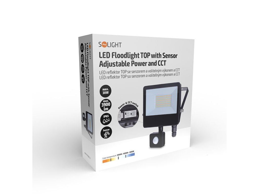 Solight LED reflektor se senzorem TOP, 30W, max. 3900lm, 3CCT, volitený výkon 100/66%, IP65, rychlospojka