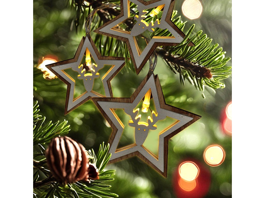 Kouzelný vánoční řetěz s dřevěnými hvězdami dodá vašemu interiéru přírodní a rustikální atmosféru. Na délce 1,5 metru je rozmístěno 10 LED diod, které jemným teple bílým světlem rozsvěcují vyřezávané dřevěné hvězdy. Jednoduchý design v kombinaci se světlem zajišťuje decentní, ale efektní dekoraci například na okenní parapet, stěnu nebo poličku.
