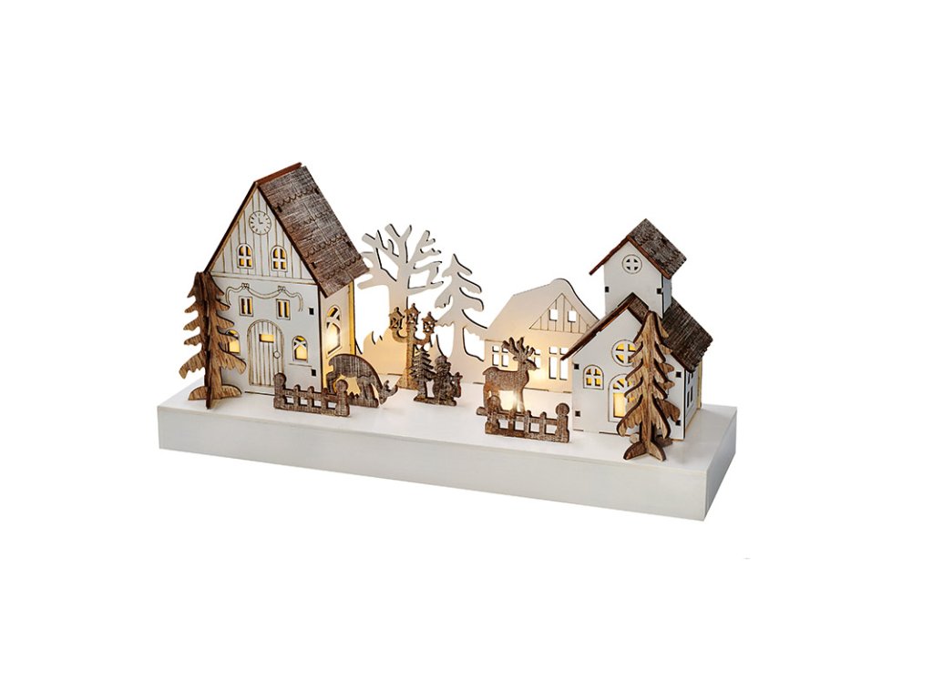 Tato dřevěná dekorace v podobě malebné vánoční vesničky nabízí jemné osvětlení pomocí čtyř LED diod s teplou bílou barvou. Propracované detaily domků a stromečků v kombinaci s přírodními materiály působí útulně a tradičně. Rozměry 34 × 8 × 17 cm ji činí ideální pro použití na poličku, parapet nebo komodu.