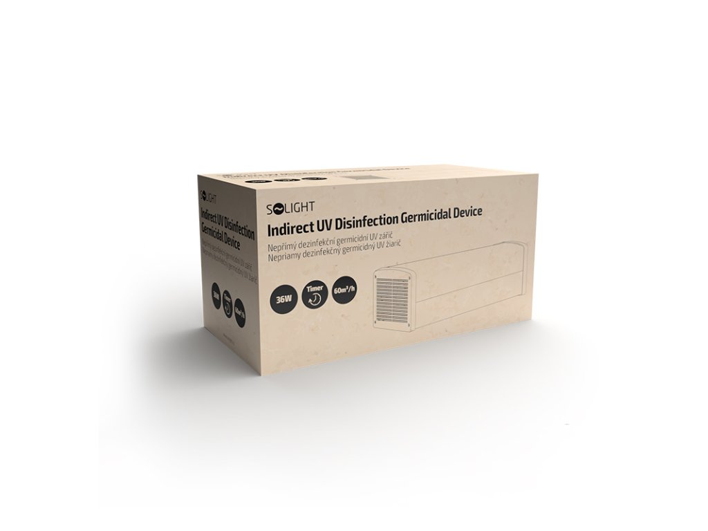 Nepřímý UV zářič 36W pro efektivní dezinfekci vzduchu bez přímého vlivu UV-C záření na prostory. Bezpečné použití při pobytu v dezinfikovaných prostorách. Tři možnosti časovače pro flexibilní používání a životnost UV-C zářiče až 5000 hodin. Likviduje viry, bakterie, plísně, houby a hmyz. Rychlejší než chlór a efektivnější než kyselina chloritá. Dálkový ovladač s dosahem 20m. Možnost montáže na zeď (montážní materiál v balení). Napájení 230V/50Hz, průtok vzduchu 60m3/h, krytí IP20. Rozměry: 64 × 11 × 13 cm.