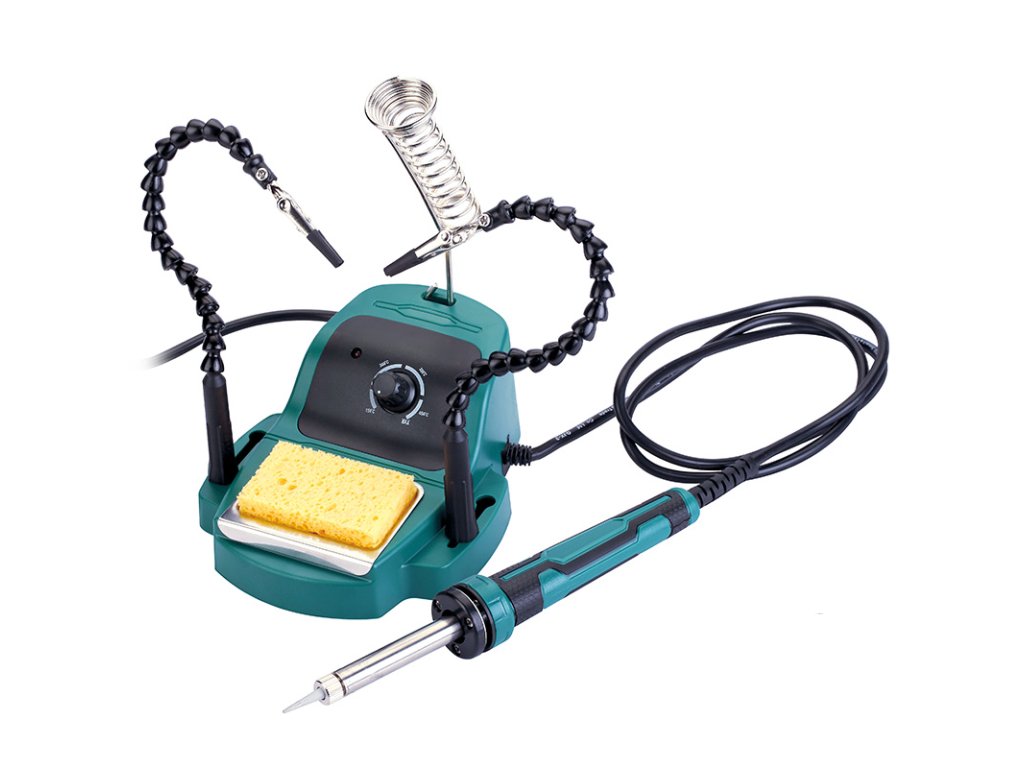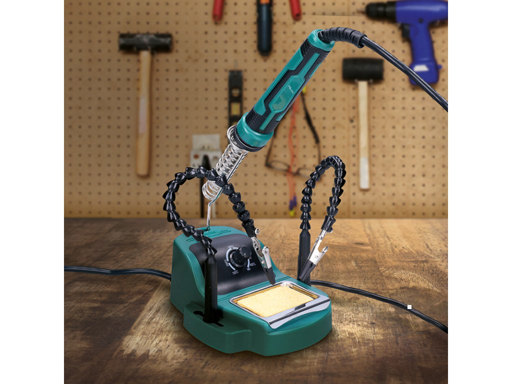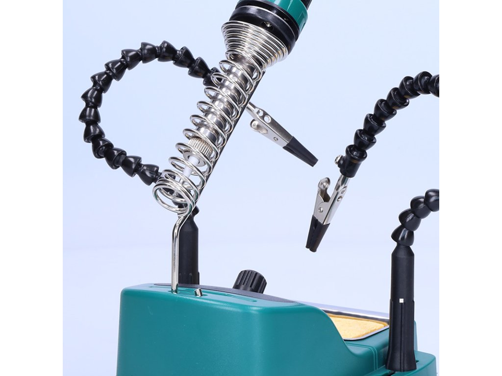 Kompaktní páječka s 360° otočnými krokosvorkami, ideální pro práci s různými velikostmi součástek a desek. Silikonový kabel je měkčí a tepelně odolný pro pohodlné používání. Výkon 48 W s teplotním rozsahem 160–480 °C a keramickým topným tělesem pro rychlé a stabilní zahřívání. Příslušenství zahrnuje stojánek na pájecí pero a držák houbičky pro čištění hrotu. Napájení 230V, 50Hz.