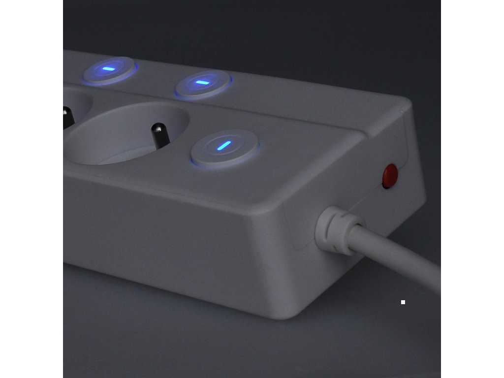 Přívod s šesti zásuvkami a celkem sedmi vypínači nabízí maximální kontrolu nad připojenými zařízeními. Díky samostatným vypínačům šetříte nejen elektřinu, ale i životnost spotřebičů. Sedmý hlavní vypínač umožňuje odpojit všech pět zásuvek najednou. Decentní modré podsvícení signalizuje, která zásuvka je právě aktivní.