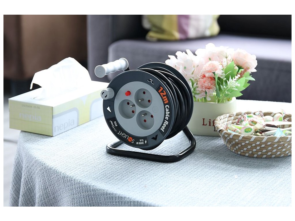Klasický design upravený do malých rozměrů je stejně výkonný jako velký buben, přesto mnohem skladnější a snadněji přenositelný. Tři zásuvky s dětskými pojistkami jsou chráněny tepelnou pojistkou, která přeruší napájení v případě přetížení nebo při plné zátěži bez úplného odvinutí kabelu.