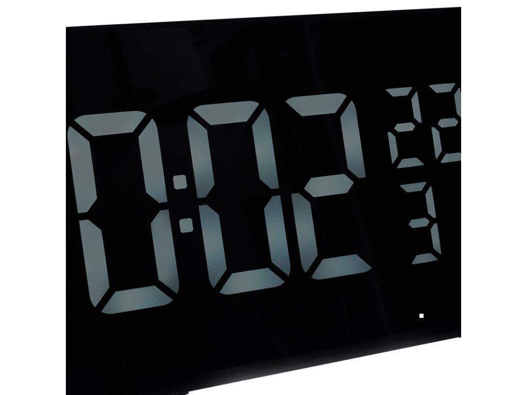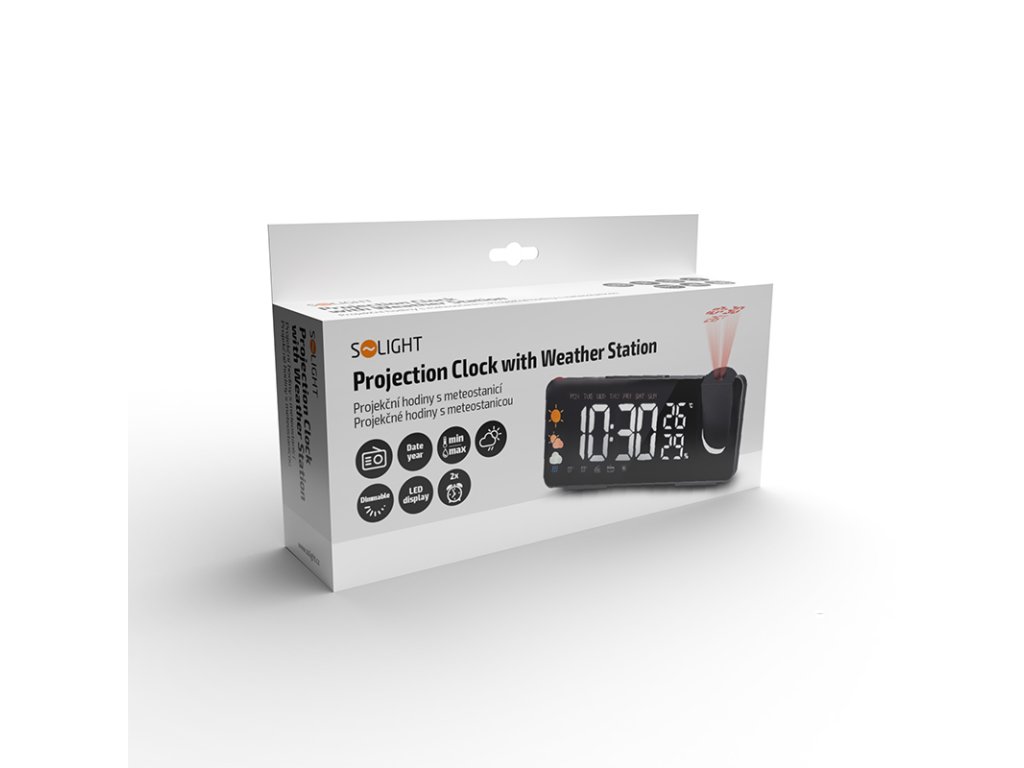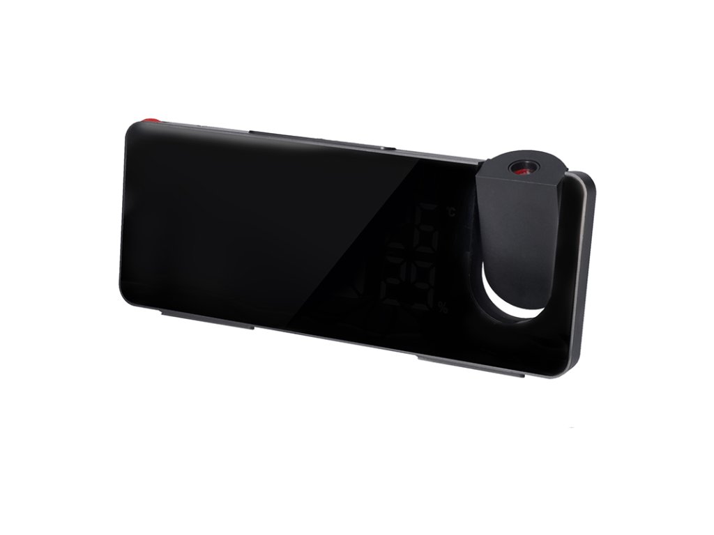 Tento moderní budík kombinuje projekci času a teploty, FM rádio (87,5–108 MHz) a předpověď počasí. Má duální budíky s možností nastavení pro všední dny, víkend nebo denní buzení a tón budíku lze nastavit jako rádio. LED displej s nastavitelným jasem a možností otočení projekce o 180° pro pohodlné zobrazení. Měří teplotu (-9°C až +50°C) a vlhkost (20–95%).