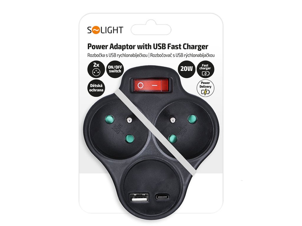 Solight rozbočka s USB A+C rychlonabíječkou 20W PD, 2 x 10A, černá, vypínač