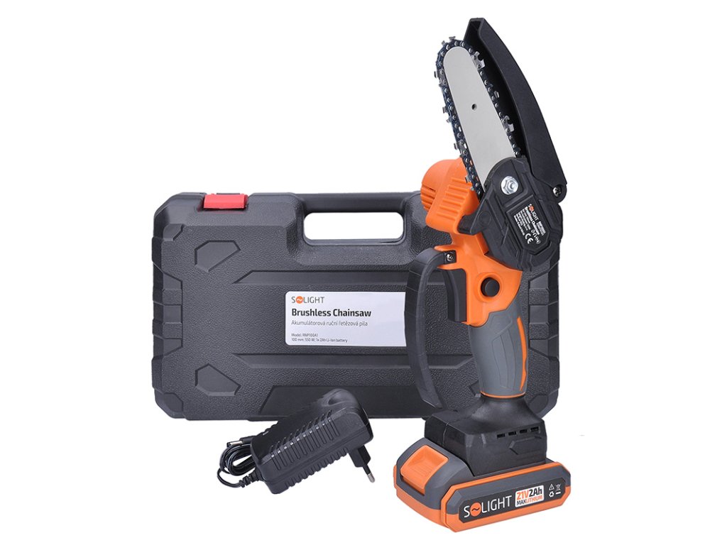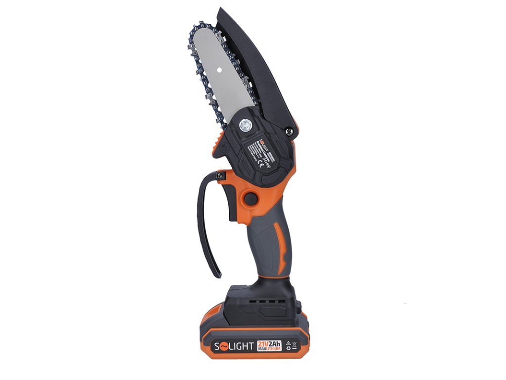Součástí balení je Li-Ion baterie 21V s kapacitou 2Ah, která poskytuje dostatek energie pro běžné prořezávací úkony. Baterii lze plně nabít za cca 150 minut pomocí přiložené nabíječky. Pro prodloužení doby práce je možné dokoupit další baterie s kapacitou 2Ah, 4Ah nebo 6Ah a také rychlonabíječku Solight RN-RNB.