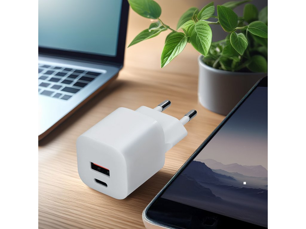 USB-C a USB-A 20W PD GaN rychlonabíječka s dvěma výstupy pro efektivní nabíjení. Vstup: AC 110-240V, 0,5A, 50-60Hz. Výstupy: USB-C 5V3A, 9V2.2A, 12V1.67A; USB-A 5V3A, 9V2A, 12V1.5A; USB-A+C 5V3A. Barva: bílá. Kompaktní nabíječka ideální pro rychlé a bezpečné nabíjení více zařízení současně.